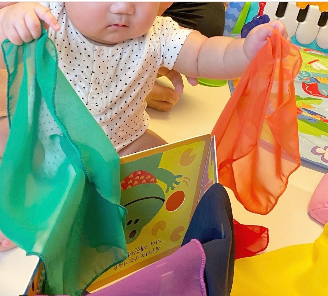 색깔 스카프, 색깔 공 등의 자료를 준비해 놀이할 수도 있다. 만약 색깔 관련 교구가 없다면 여러 가지 색깔의 놀잇감들을 가져오거나 색종이만 있어도 된다. 그림책을 보면서 책 속 색깔과 같은 색의 사물을 보여주는 것 자체가 색깔 놀이가 될 수 있기 때문이다.