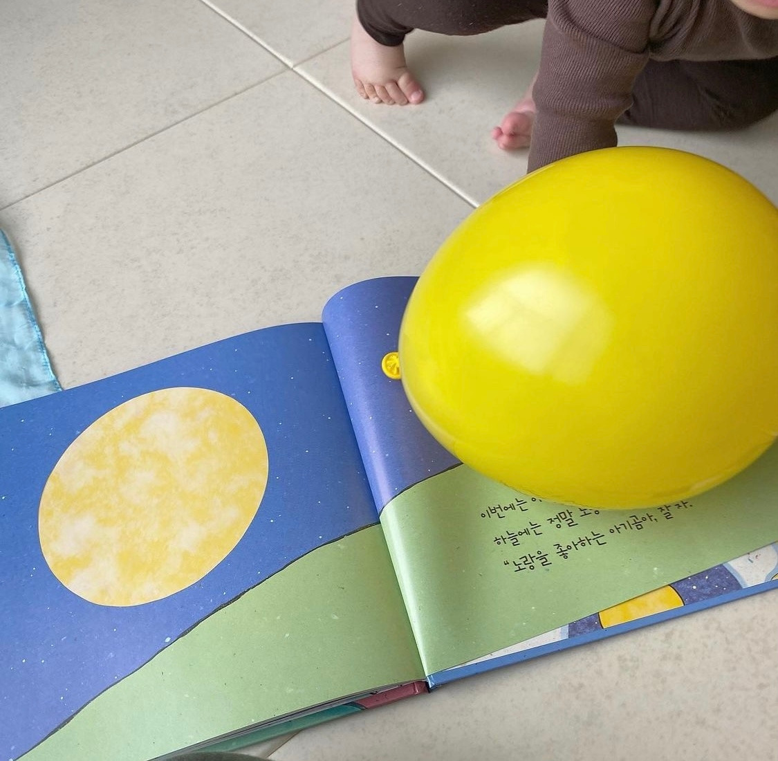 [음률] 동요 '달' 불러주며 풍선 움직여주기: 달 주제의 그림책을 보았다면 풍선놀이를 할 때 풍선을 보름달처럼 상상해 놀이해 주면 재미있다. 달 동요를 부르며 달을 아래에서 위로 움직여 줄 수도 있고, "이현이 머리 위에 떴지"하며 가사를 개사해 아기의 머리 위에 풍선을 대줄 수도 있다.