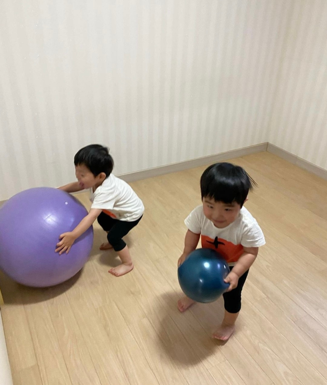 또한 짐볼보다 작은 크기의 고무공을 준비해 함께 놀이하는 것도 좋다. 크고 작은 공을 가지고 놀며 자연스럽게 크기에 따른 공의 움직임 차이를 인지할 수 있게 된다.