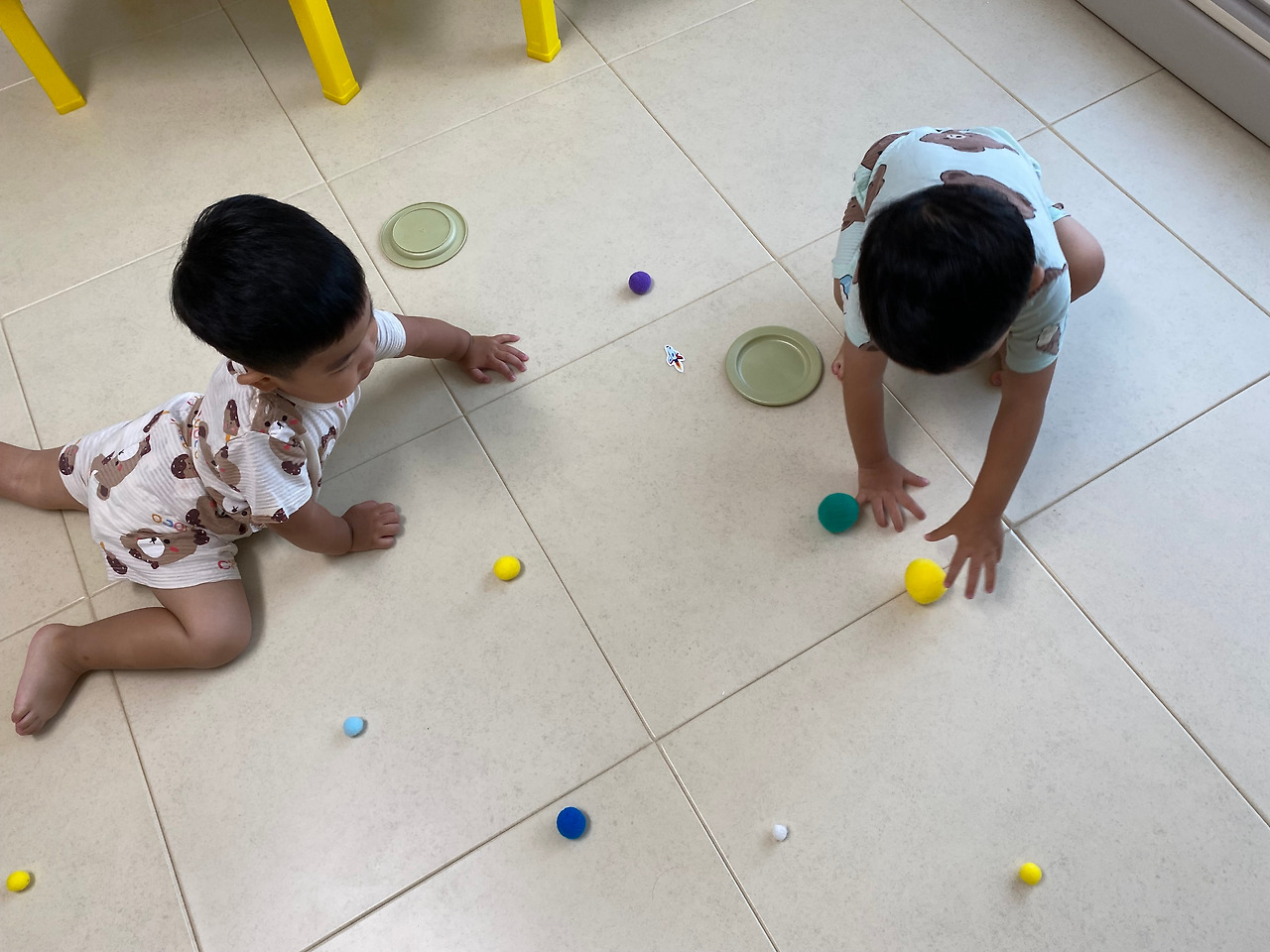 자신의 앞에 있던 솜공이 다른 방향으로 데구루루 가는 모습, 통 튕겨가는 모습을 본 아이들은 매우 재미있어하며 엎드린 자세로 한동안 솜공 튕기기에 집중한다.