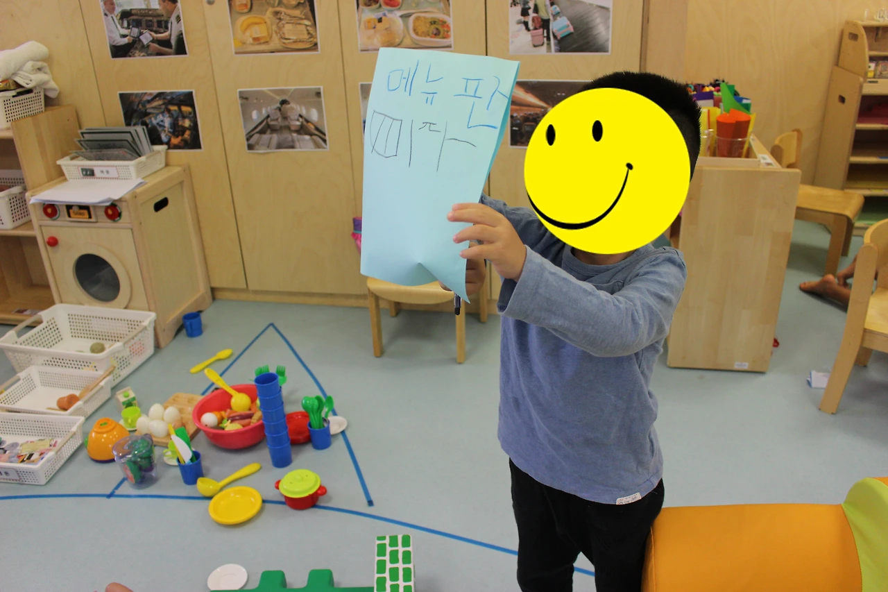 - 유치원에서 아이들이 식당 놀이를 합니다. 놀이 중 글자의 필요성을 자연스럽게 느끼게 되지요.