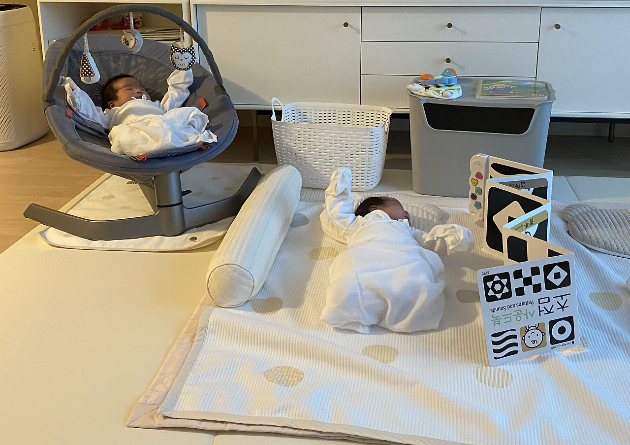 쌍둥이 육아는 두배로 힘든게 당연하지만 그만큼 재미도 있는 것 같다. 아이들과의 다양한 에피소드들이 두배는 더 많으니까 말이다. 그리고 생후 약 한달째인 지금은 아기들이 칭얼거릴 때, 적절한 대처를 해주기만 하면 평온한 시간을 보낼 수 있다.