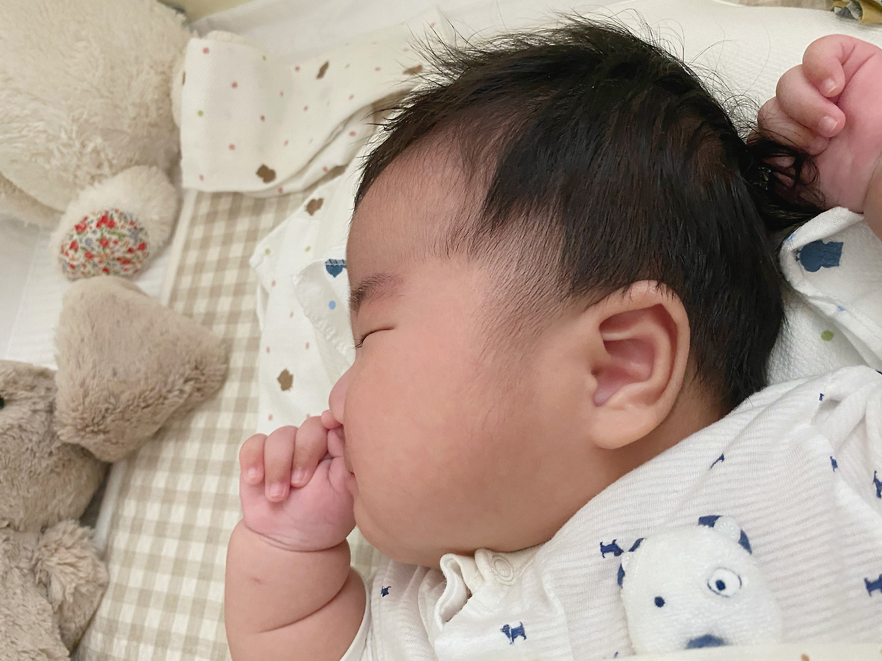 나름 성공적이라는 생각이 든 이현이 수면교육. 그리고 대략 보름이 지난 뒤 이현이의 자기 전 새로운 행동을 관찰할 수 있었다. 100일을 전후로 해서 눕히면 오른손 꼭 쥔 주먹을 '쫍쫍'빨았고 왼손은 머리카락을 쥐었다 하며 손을 어떻게 해야 할지 모르는 듯했다. 이런 행동의 증가는 이현이를 끙끙거리며 잠자기 힘들게 만들었다.(결국엔 잠에 들게는 했지만)