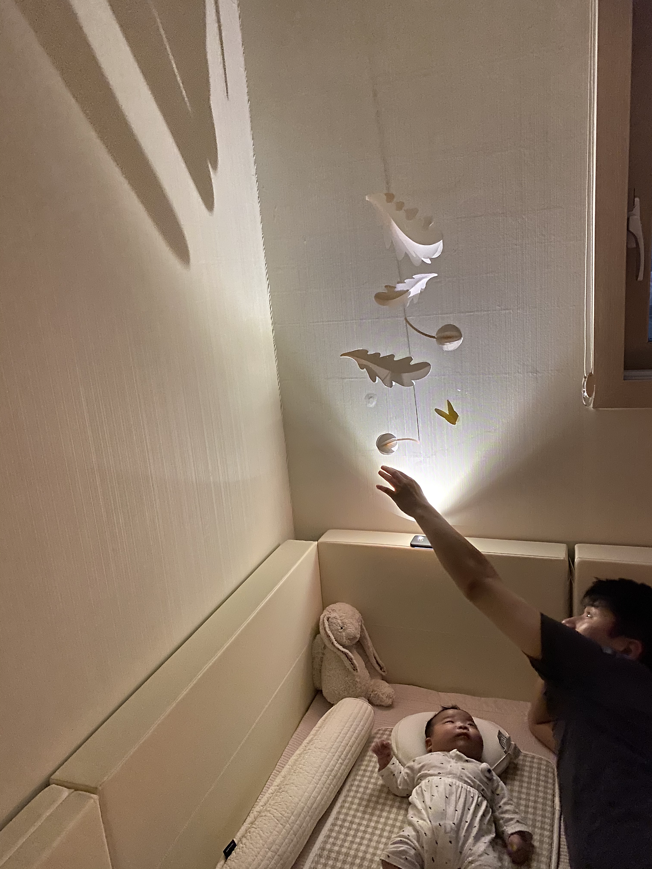 남편은 이준이에게 새로운 자극으로 관심을 끌고자 모빌에 핸드폰 조명을 비추어 천장에 모빌 그림자가 생기도록 했고 이준이는 천장에 생긴 그림자를 보며 진정했다. 하지만 단 이틀만 통했던 방법.