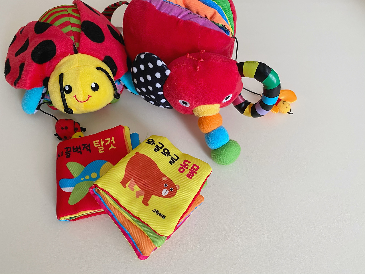 헝겊책을 만지며 촉감을 느껴보고 알록달록한 책의 색감들을 눈으로 익히며 다양한 색깔에 관심을 가질 수 있다는 것이 헝겊책의 매력인 것 같다. 또 헝겊책의 종류에 따라 고리가 달려있거나 아기들이 좋아하는 봉지 소리가 나는 책도 있어 아기들의 호기심을 자극하고 소근육 발달도 도모할 수 있다.