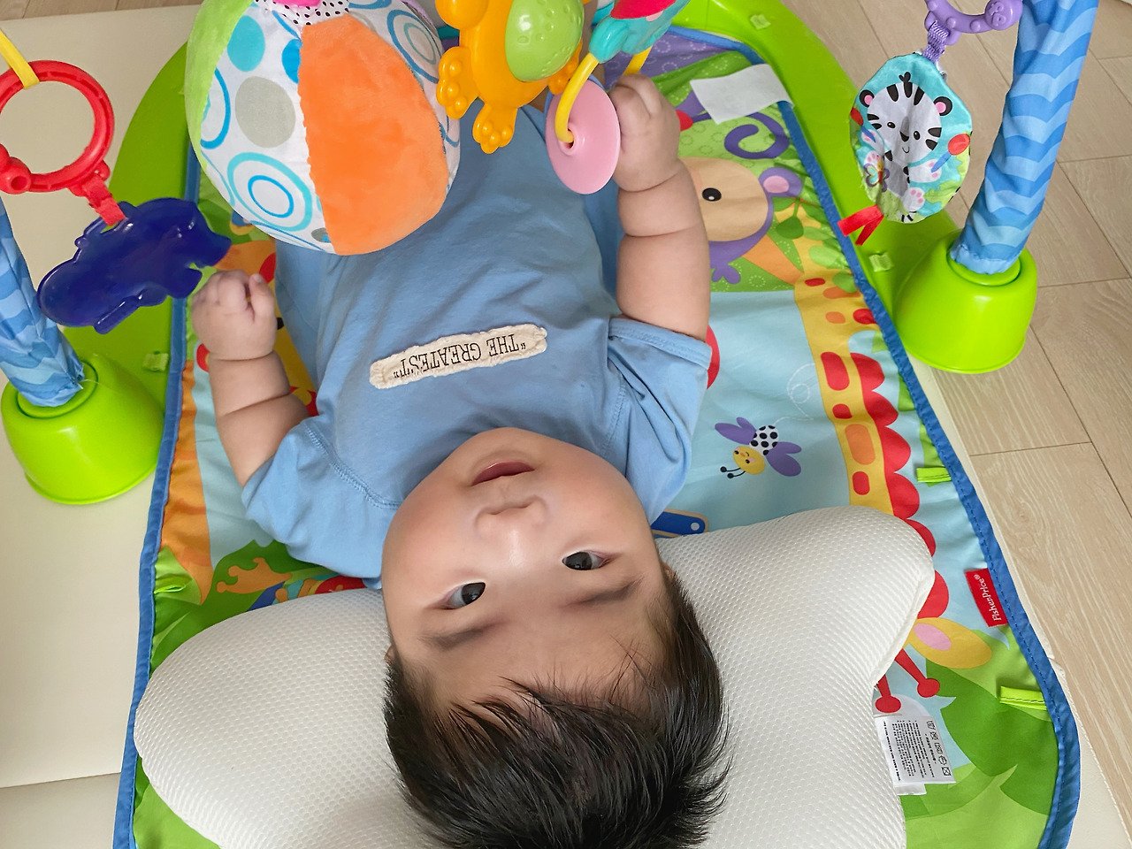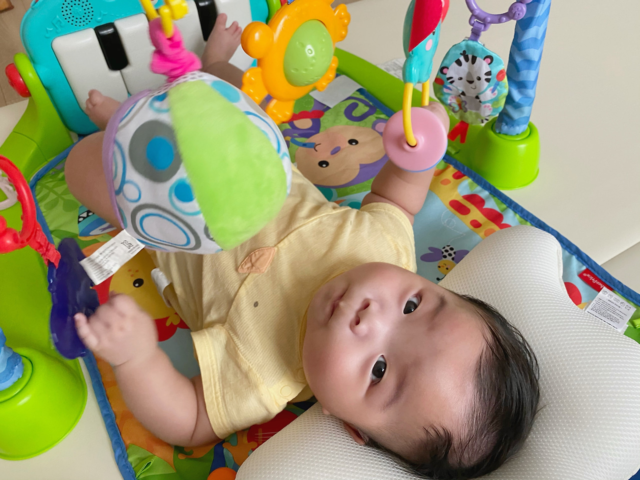 생후 143일 차인 지금은 혼자 팔다리를 바둥거리며 피아노 건반을 치고, 모빌을 잡고, 소리도 지르며 아기체육관을 마음껏 즐기고 있다.