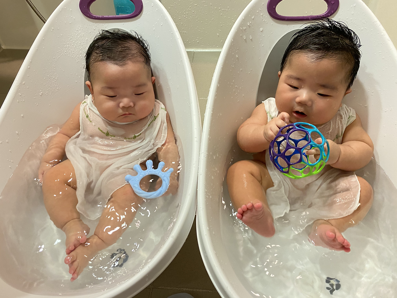 목 튜브 놀이 이후에 우리 아기들은 점점 포동 해져 튜브가 목에 잘 맞지 않았고 아기들이 튜브를 답답해 하기 시작했다. 때문에 100일 이후부터는 작은 아기 욕조에 기대어 앉아 할 수 있는 물놀이들을 간단히 해주었다.