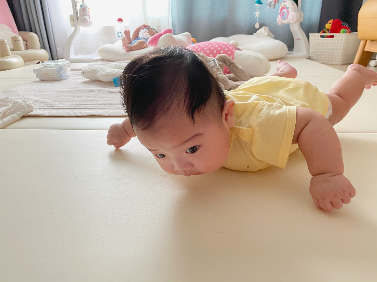 아기를 엎드려 놓으면 가슴까지 든다. 이때 두 다리가 공중으로 바둥바둥 뜨기도 한다. 마치 슈퍼맨이 하늘을 날아가는 모습처럼 말이다. 그러다 순간 갸우뚱해서 옆으로 넘어질 때도 있는데 이런 일이 한번 발생하고 나서부터 바로 옆, 가까이에 대기하고 있다가 잡아주게 된다.