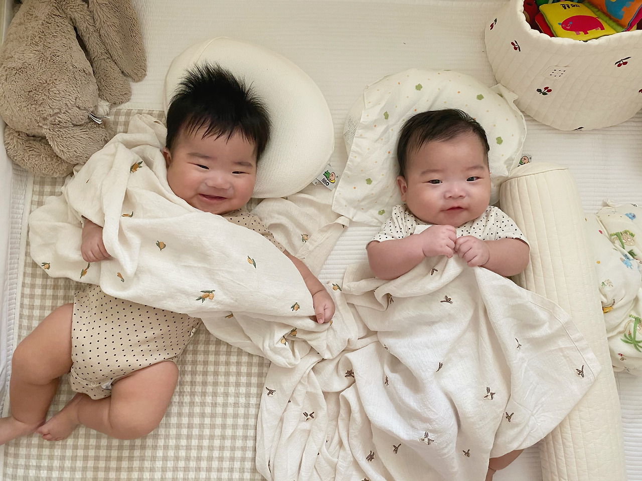 생후 4개월 혹 빠르면 3개월에도 뒤집는 아기가 있다. 그러나 아직 우리 아기들은 뒤집지는 않았다. 농담인지 진담인지 우리 아기를 본 친척 언니와 아기들의 몸무게를 들은 지인은 아기가 무거워서 뒤집기 힘들어 할 수도 있다고 했다. 그 말에 스리슬쩍 동의하게 된 건 왜일까. 포동포동한 지금 우리 아기들이 순간 또 귀여워졌다.