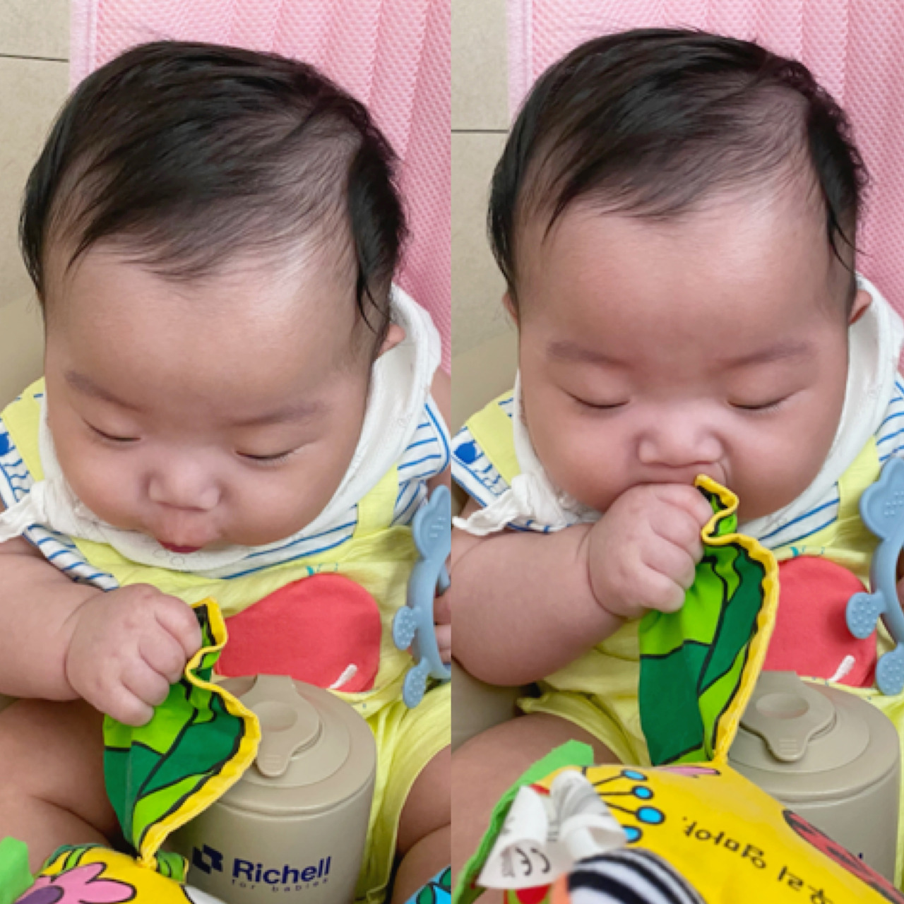 아직 두꺼운 것은 잡기 힘들어하고 손에 잡히는 것을 잡고 흔들거나 반대편으로 바꿔 잡는 경우는 없지만, 이전보다 놓치지 않고 잘 잡고 있는 모습을 보면 너무나도 대견하다.