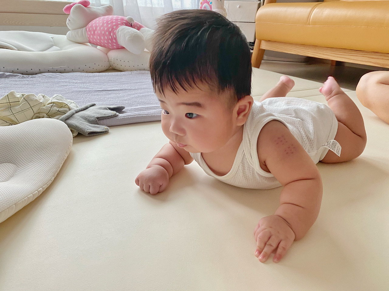 엎드려 있는 아기의 모습을 지켜보고 있으면 조금 앞으로 전진해 있기도 하고 방향이 바뀌어 있기도 한다. 특히 전진하려는 모습을 보면 곧 기어 다닐 아기의 모습이 상상되기도 하고.