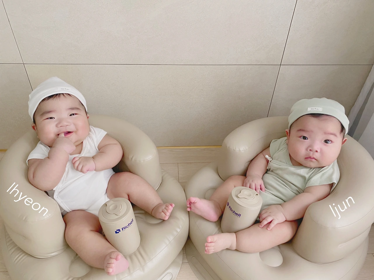 생후 100일 경. 100일 촬영을 위해 처음으로 범보 의자에 아기들을 앉혀 보았다. 거의 끼우는 식이라 아기가 앉았다고 할 순 없지만 겉으로 보는 모양새는 아기가 앉은 것이 확실했다.