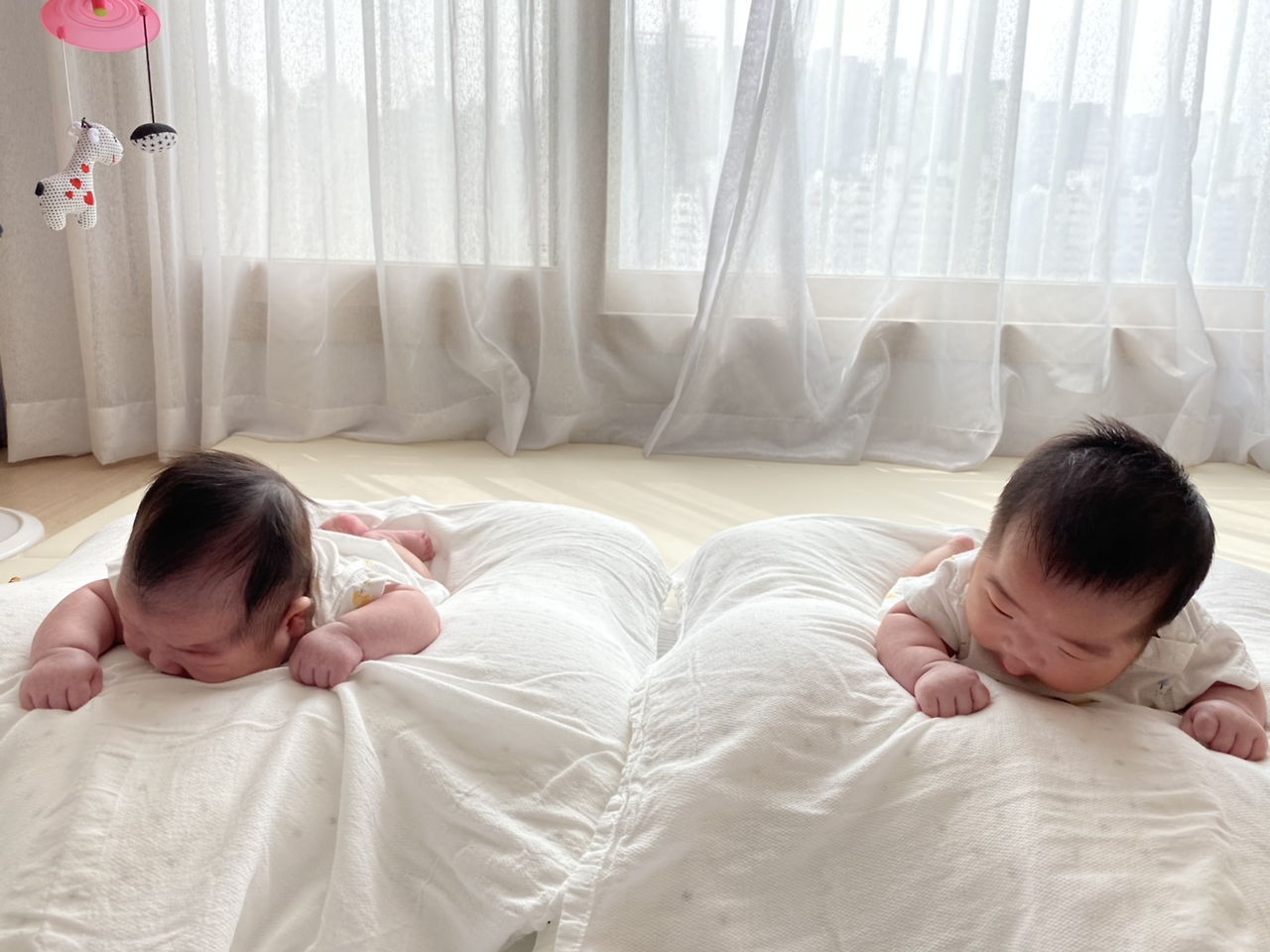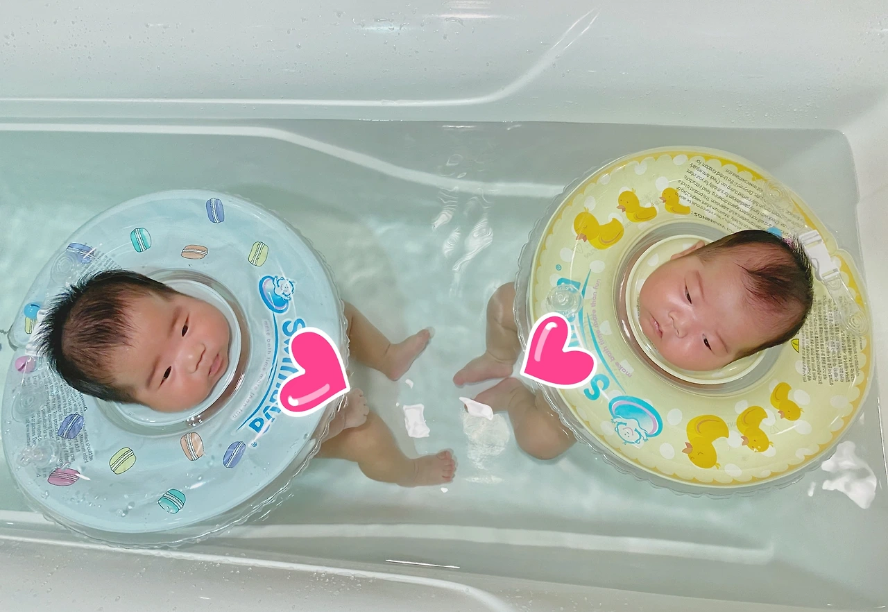 생후 61일째, 아기들이 태어난 지 딱 두 달이 지나갈 시점 물놀이를 처음 해주었다. 목 튜브를 사용한 물놀이였는데, 목욕을 할 때 만 물을 접하던 아기들이 놀이를 위해 물에 들어가는 건 최초의 일. 아기들에게는 분명 새로운 경험이었을 것이다.