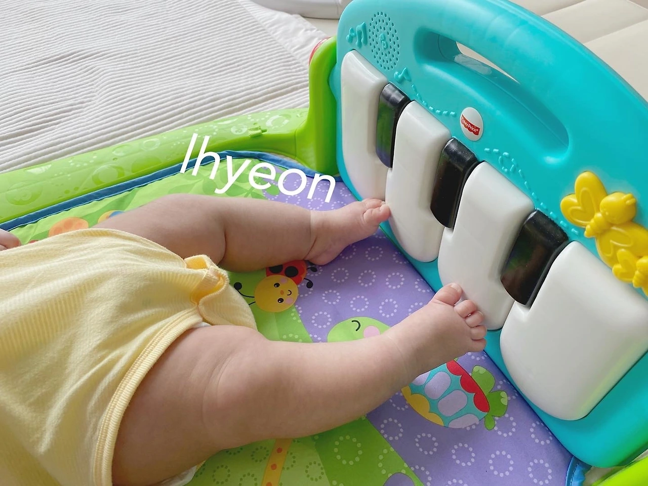 아기체육관은 아기가 누워서 할 수 있는 놀이들의 종합 선물 같았다. 누워만 있는 아기가 발을 바둥바둥 움직이면 우연히 아래 비치된 피아노 건반 모양을 치게 되어 건반을 누르는 소리를 들을 수 있고, 눈높이에 달려있는 모빌은 아기의 시각을 자극해 모빌을 잡아보게끔 한다. 이 시기 아기들은 아직 팔의 움직임은 크지 않았고 발을 주로 움직여 건반 소리를 들려주었다.