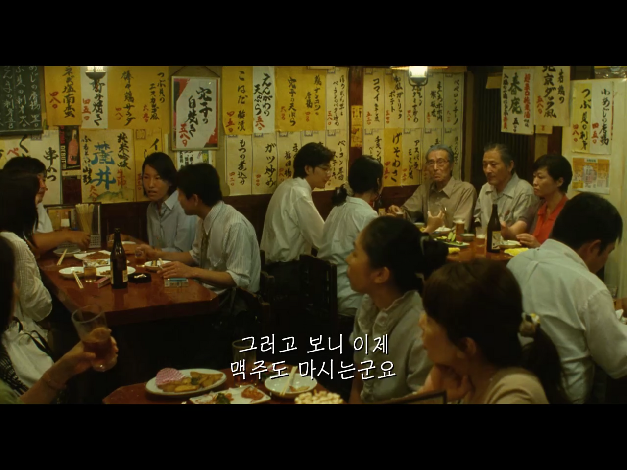 시간이 흘러 다시 회식자리. 이번에는 맥주를 한번에 들이킨다. 선배가 묻는다. "그러고 보니 이제 맥주도 마시는군요" "네, 이젠 다 마실 수 있어요." 신입이 친하지 않았던 건 맥주만이 아니었을거라 생각한다. 영화 속 신입처럼 내게도 가장 맛있는 술은 친한 사람과 함께 하는 술이었다. 그런 술을 마신 지 오래된 것 같다. 오늘따라 그때가 그립다.