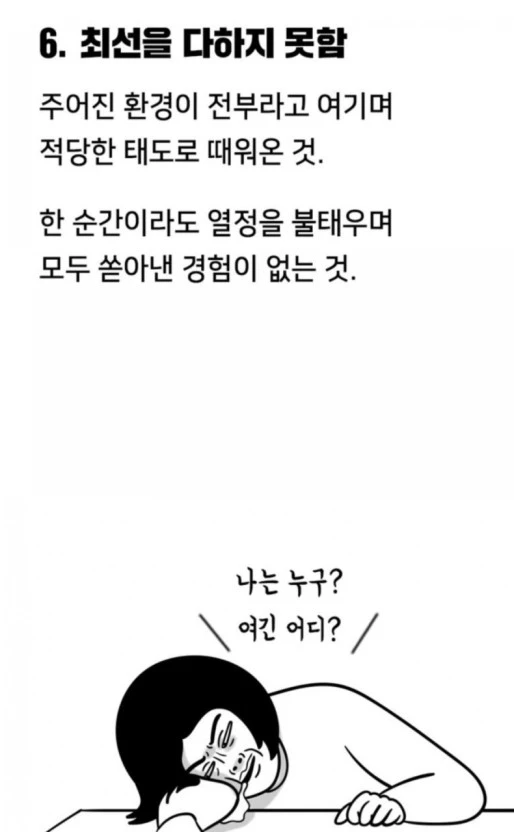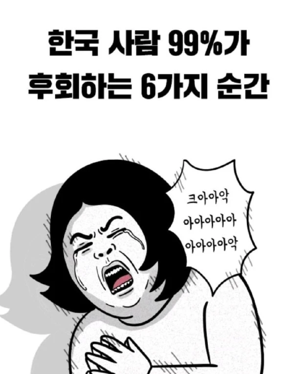 그렇다면 어떤 후회를 하는지 보면 포털에 돌아다니는 '한국 사람 99%가 후회하는 6가지 순간'이 있다고 한다.