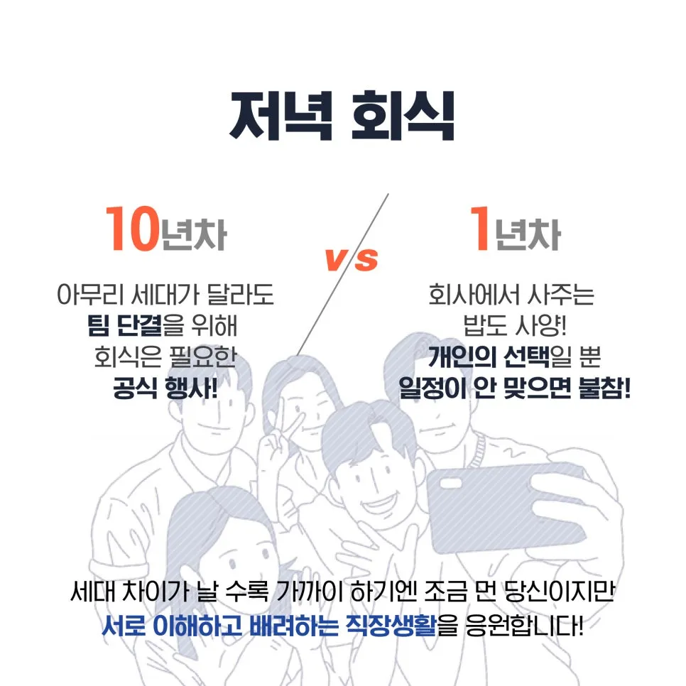 직장 내에서 세대차이는 앞으로 계속될 불편함이라고 할 수 있겠다. 같은 세대 또는 또래로 구성된 회사라면 문제가 없겠지만 큰 대기업, 중소기업은 세대 간 차이가 명확히 드러날 것이라고 생각한다. 누군가는 당연한 것들이 다른이 에게는 당연한 게 아닐 수 있기 때문에 그 생각 차이에서 나오는 불편함들이 존재할 수 있다. 그 예로 회식문화가 있을 수 있겠다. '회식은 근무의 연장선 vs 회식은 자유'