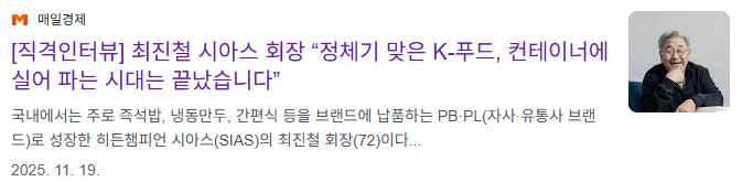 최근 시아스(SIAS) 최진철 회장이 던진 화두는 우리 식품 산업에 뼈아픈 경종을 울린다. 그는 “K-푸드가 정체기를 맞았으며, 한국에서 만들어 배에 실어 보내는 시대는 끝났다”라고 단언한다. 컨설팅 관점에서 볼 때, 이는 단순한 경고가 아니라 K-푸드의 지속 가능성을 위한 ‘비즈니스 모델의 전면적 재설계’를 요구하는 목소리다.