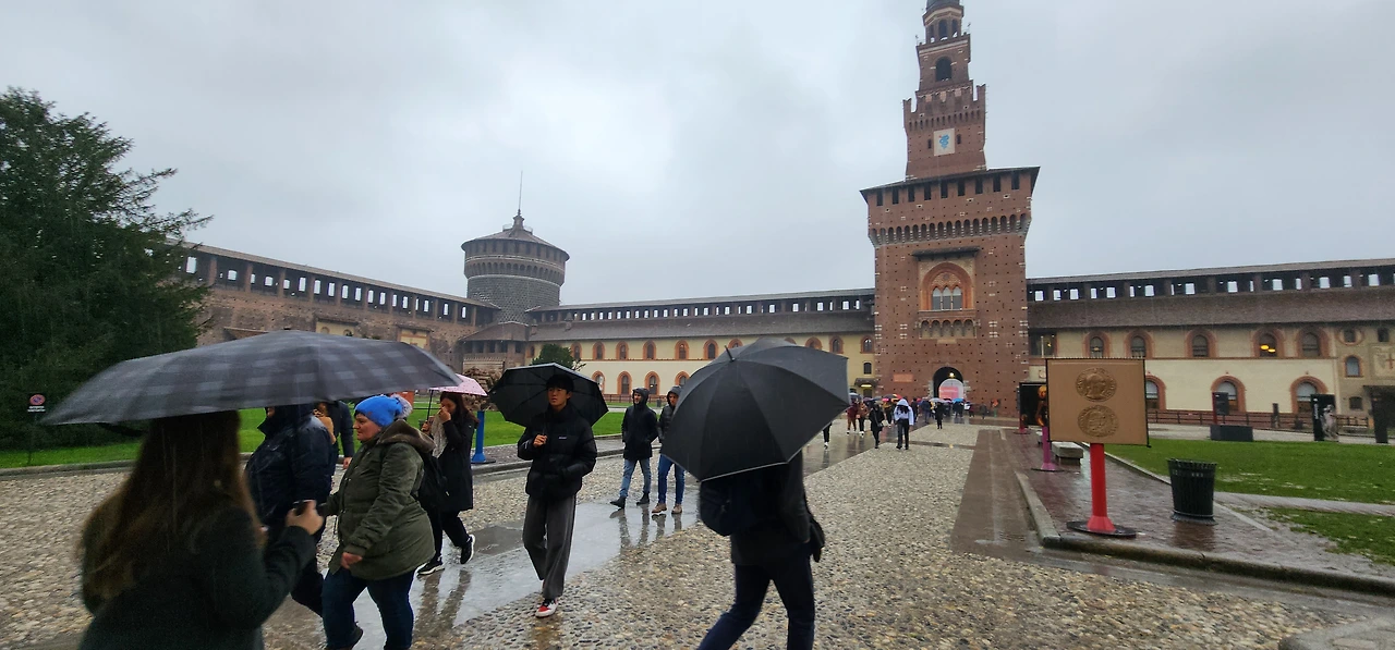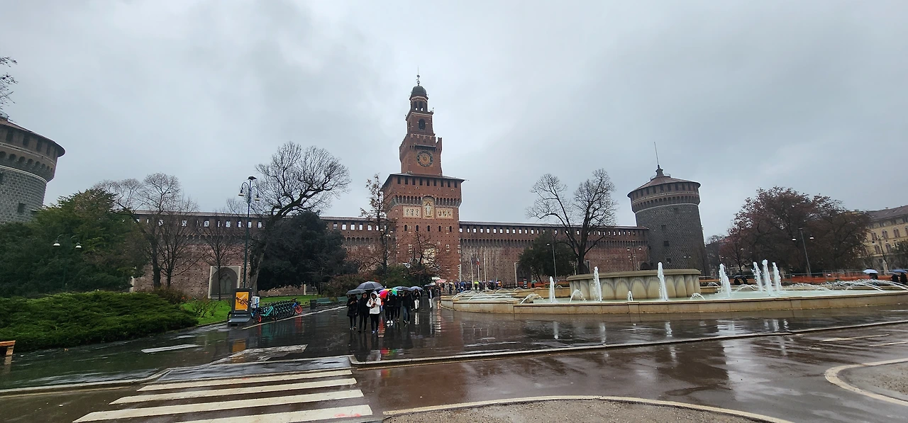 스포르체스코 성은 밀라노의 영주 프란체스코 스포르차의 명에 의해 15세기에 지어진 성이다. 비가 와서 그런지 더 웅장하고 아름답게 보인다. 레오나르도 다빈치, 브루넬리스키 등이 설계에 참여했다 하니 역사의 한 곳에 와있는 기분이다.