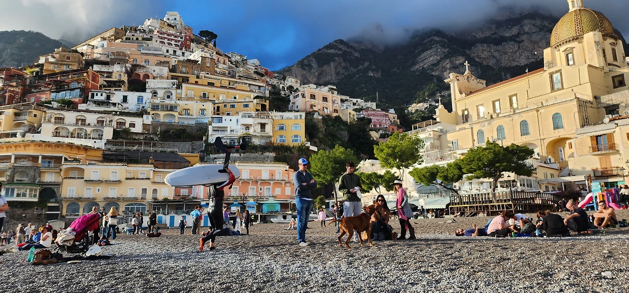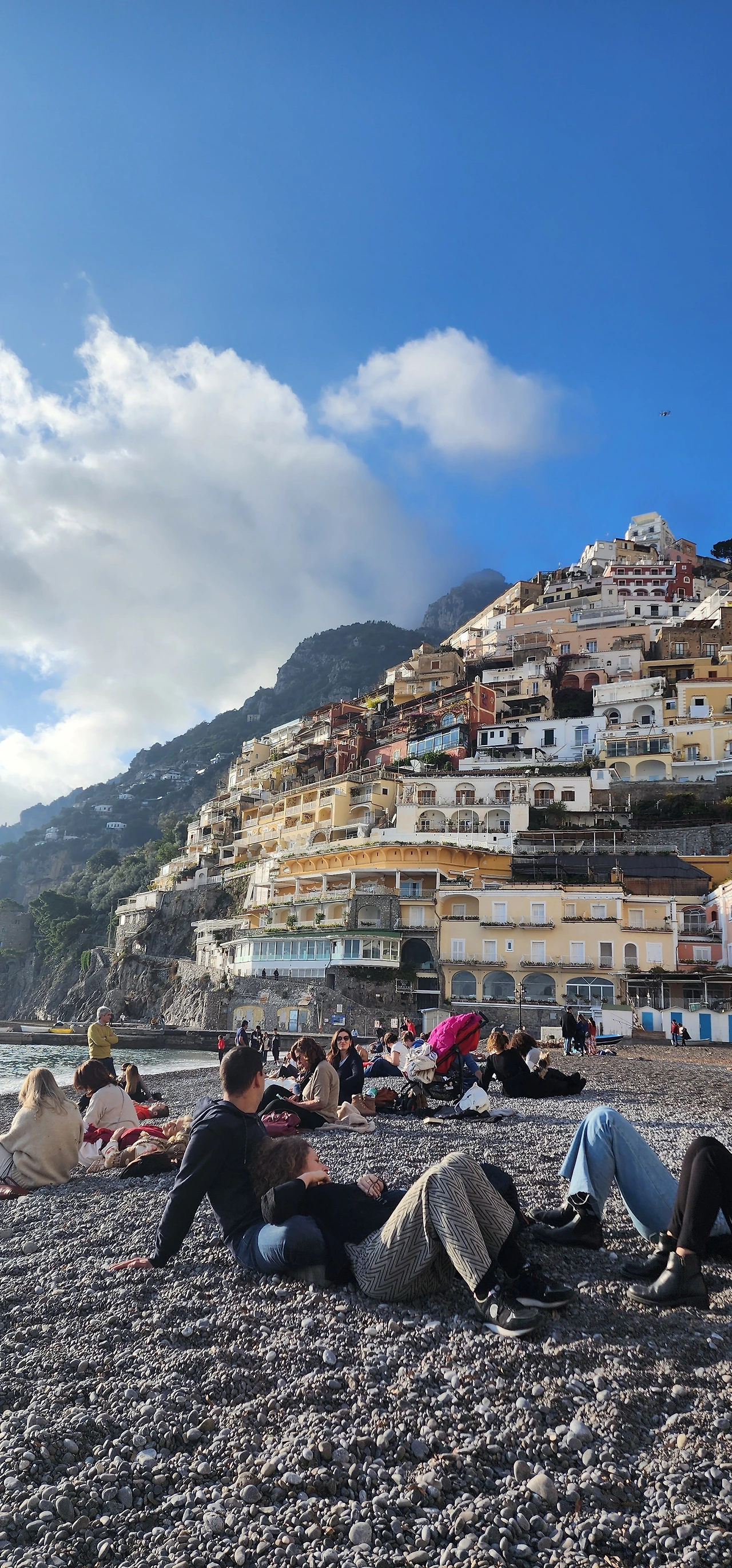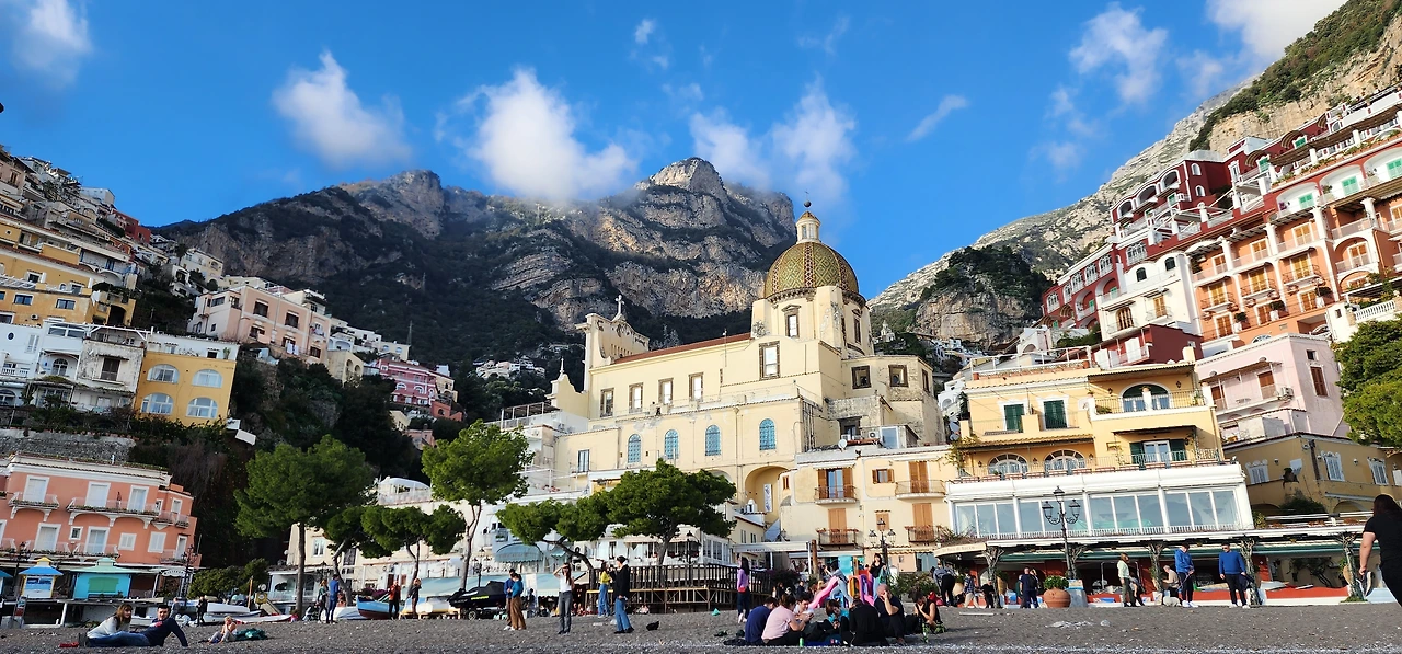 나폴리에서 산 중턱을 지나 지중해의 아름다움을 느끼다 보니 버스가 포지타노 언덕에 도착하였다. 차 한 대가 겨우 빠져나갈 만한 골목을 따라 내려가며 주위를 둘러본다. 절벽을 타고 아슬아슬하게 집들이 빼곡히 있다. 검은 모래가 많은 해변으로 가서 지중해도 만져보았다. 해변에서 올려다본 마을은 색감이 조화롭고 아름답게 느껴졌다.