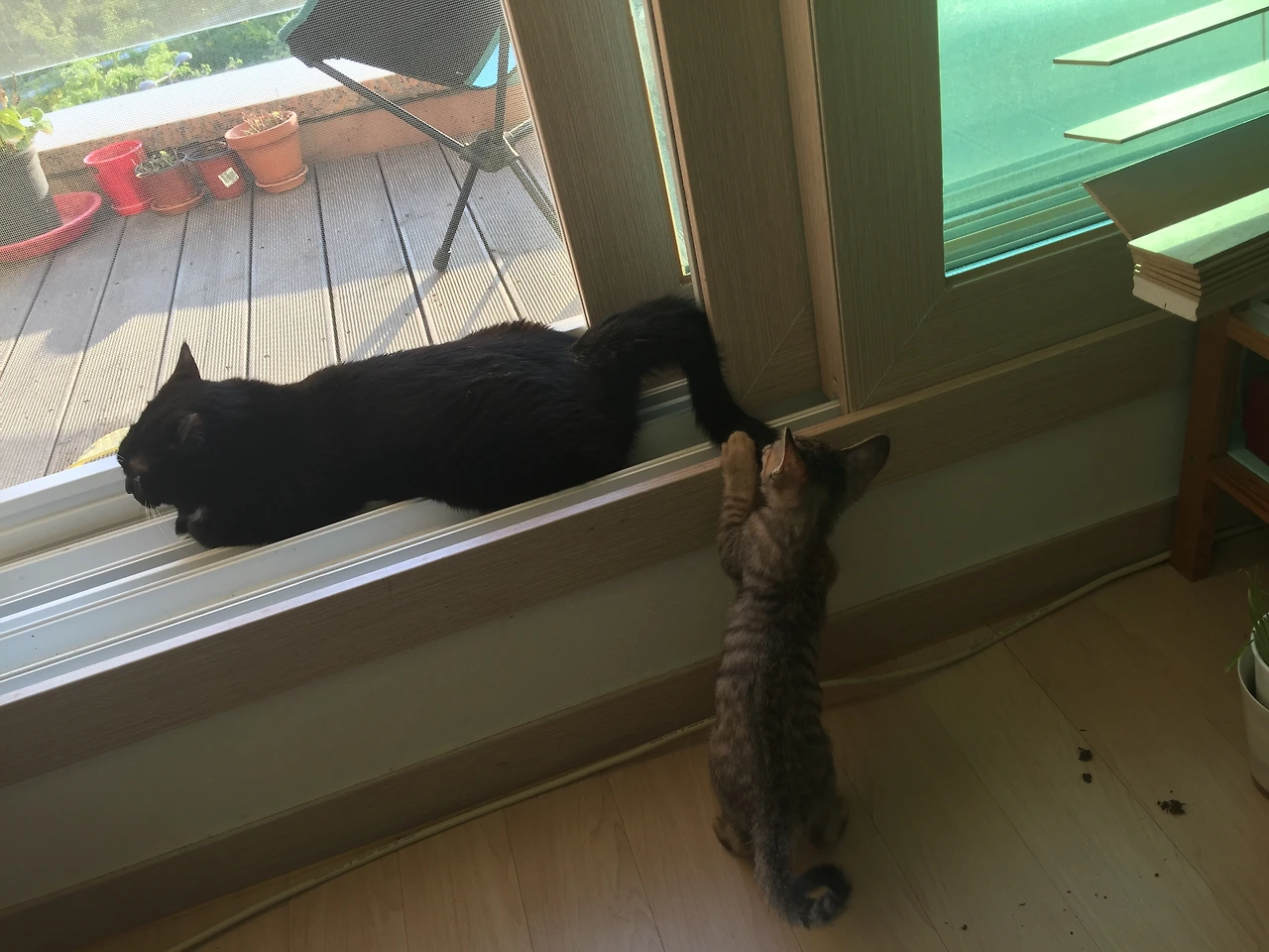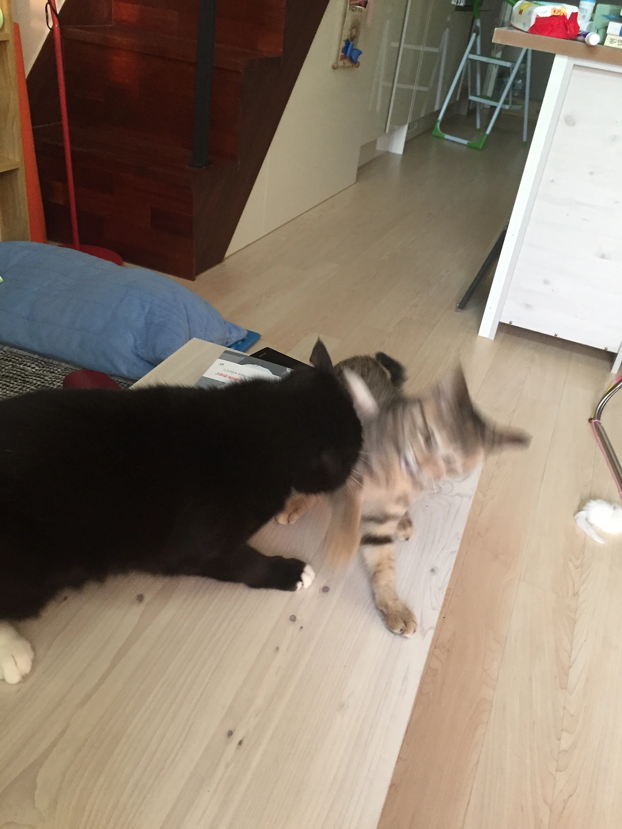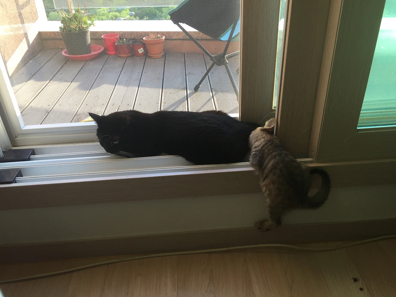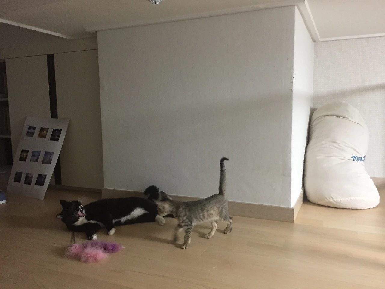 텔에 벽을 칠 수가 없어 결국 1층은 보리 2층은 밀의 터전이라고 나 혼자 임시로 거처를 정해두었지만 며칠 지나지 않아 상황은 뒤죽박죽이 되었습니다. 처음에는 자기보다 훨씬 큰 고양이 밀을 무서워하던 보리는 밀이 자기를 피하기는 하지만 헤치지 않는다는 것을 깨닫고부터 밀 꼬리를 쫓아다니는 똥꼬발랄 아깽이가 되어 갔습니다. 해먹을 하나만 설치해주니 이틀 동안 싸우다 결국 같이 자는 정도로 가까워지긴 했으나 그 외에는 둘이 붙어 있거나 핥아주거나 우애를 드러내는 일은 없었습니다.