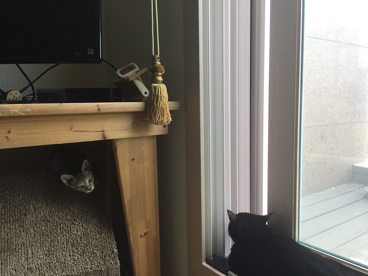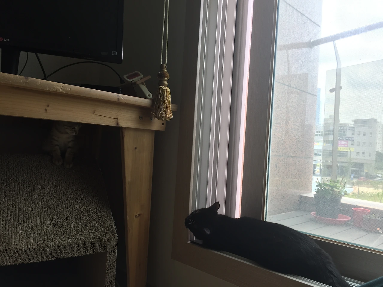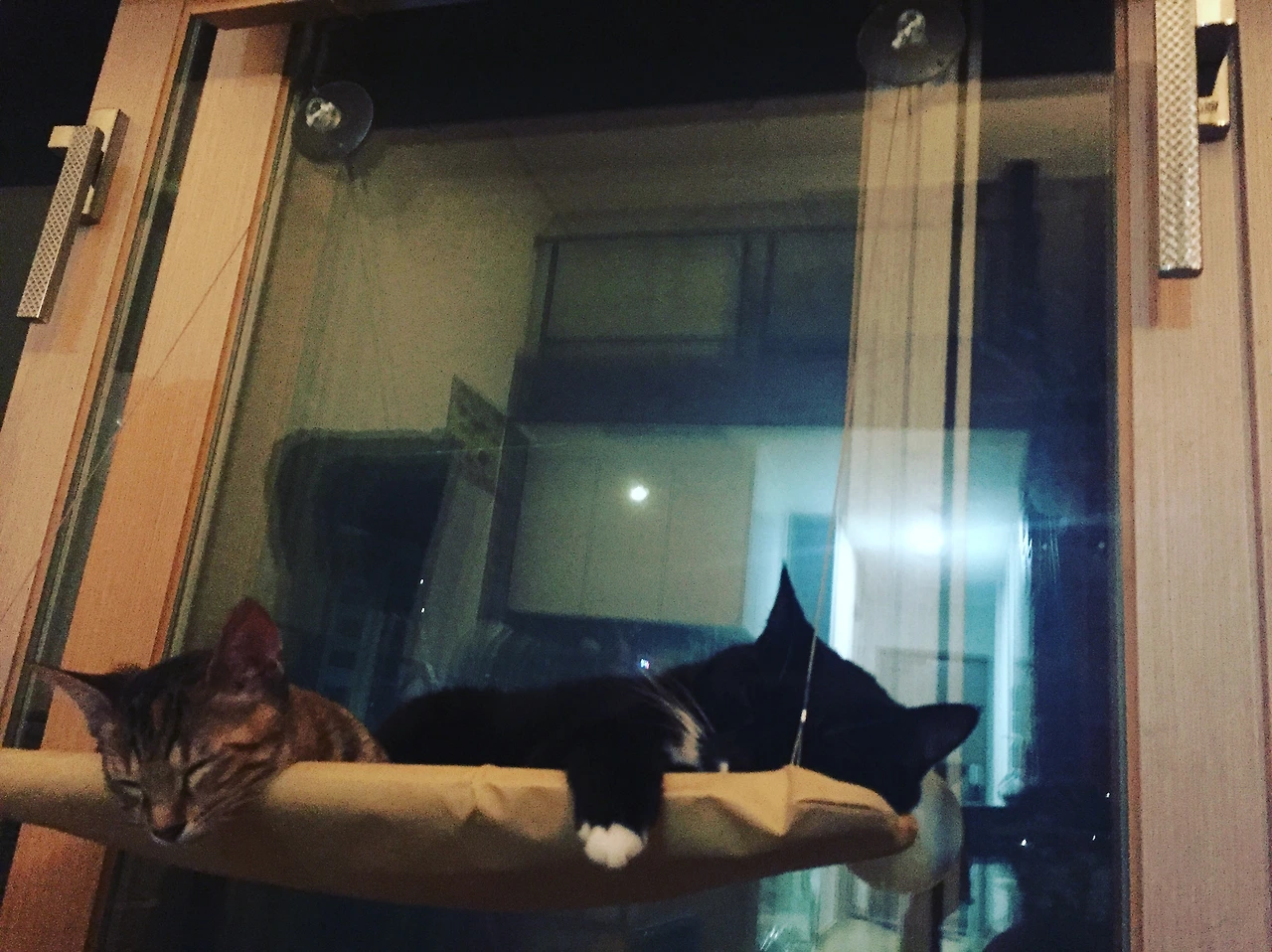 텔에 벽을 칠 수가 없어 결국 1층은 보리 2층은 밀의 터전이라고 나 혼자 임시로 거처를 정해두었지만 며칠 지나지 않아 상황은 뒤죽박죽이 되었습니다. 처음에는 자기보다 훨씬 큰 고양이 밀을 무서워하던 보리는 밀이 자기를 피하기는 하지만 헤치지 않는다는 것을 깨닫고부터 밀 꼬리를 쫓아다니는 똥꼬발랄 아깽이가 되어 갔습니다. 해먹을 하나만 설치해주니 이틀 동안 싸우다 결국 같이 자는 정도로 가까워지긴 했으나 그 외에는 둘이 붙어 있거나 핥아주거나 우애를 드러내는 일은 없었습니다.