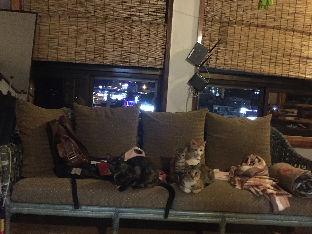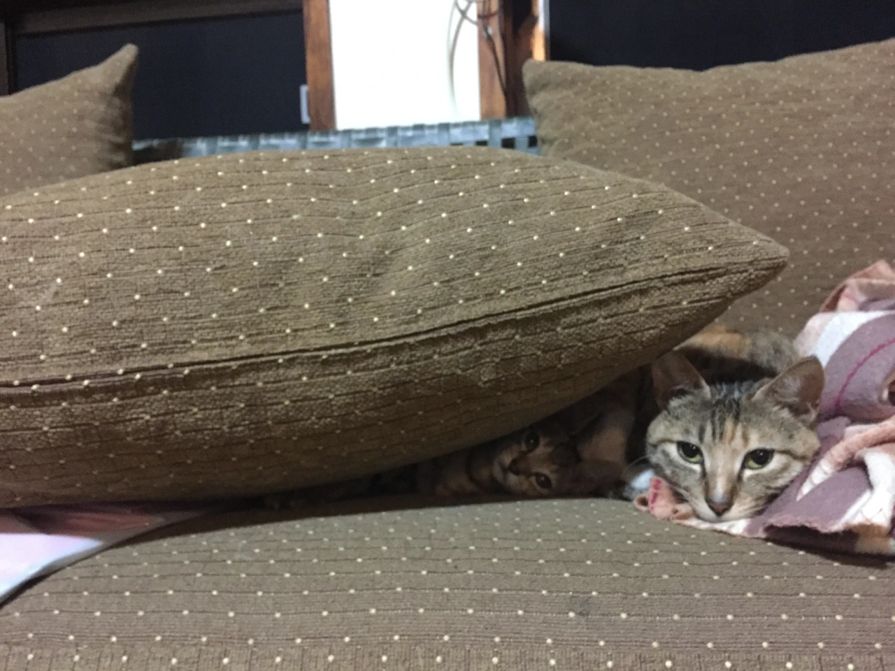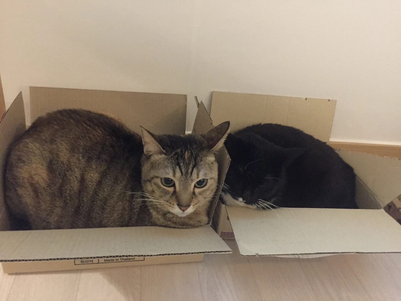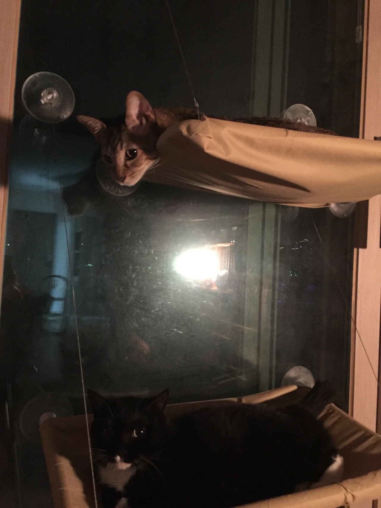 텔에 벽을 칠 수가 없어 결국 1층은 보리 2층은 밀의 터전이라고 나 혼자 임시로 거처를 정해두었지만 며칠 지나지 않아 상황은 뒤죽박죽이 되었습니다. 처음에는 자기보다 훨씬 큰 고양이 밀을 무서워하던 보리는 밀이 자기를 피하기는 하지만 헤치지 않는다는 것을 깨닫고부터 밀 꼬리를 쫓아다니는 똥꼬발랄 아깽이가 되어 갔습니다. 해먹을 하나만 설치해주니 이틀 동안 싸우다 결국 같이 자는 정도로 가까워지긴 했으나 그 외에는 둘이 붙어 있거나 핥아주거나 우애를 드러내는 일은 없었습니다.