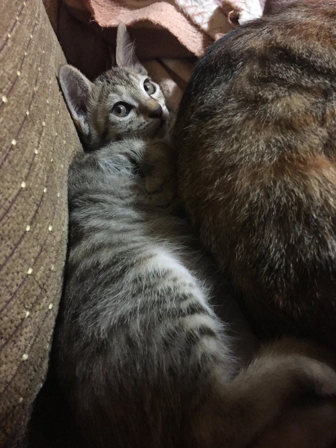 입양을 보낼 수 있는 한 입양을 보내지만 입양을 보내지 못한 아이들을 계속 키우다 보니 몇 마리는 중성화를 시키지 못하는 상황 속에 고양이가 자꾸만 불어나는 데다 전염병이라도 돌면 그 집 고양이들 모두가 위험해지는 후배의 난감한 상황에 대한 이야기를 듣다 일 년 즈음 지나서 그 집에 있는 아깽이 중 한 마리를 데려오기로 하였습니다. 마지막으로 아직 입양 보내지 못한 아깽이가 한 마리 있다고 했습니다. 이전에 전염병에 걸려 수지가 죽었다는 이야기를 들었고, 남은 아깽이는 수지의 아이라고 했습니다. 제게 밀을 데려다준 언니 이름도 수지입니다. 수지라는 이름은 나와 냥님 사이를 잇는 이름인가, 그런 생각이 들기도 하는 우연 혹은 인연이라 할 수 있을 것 같습니다.