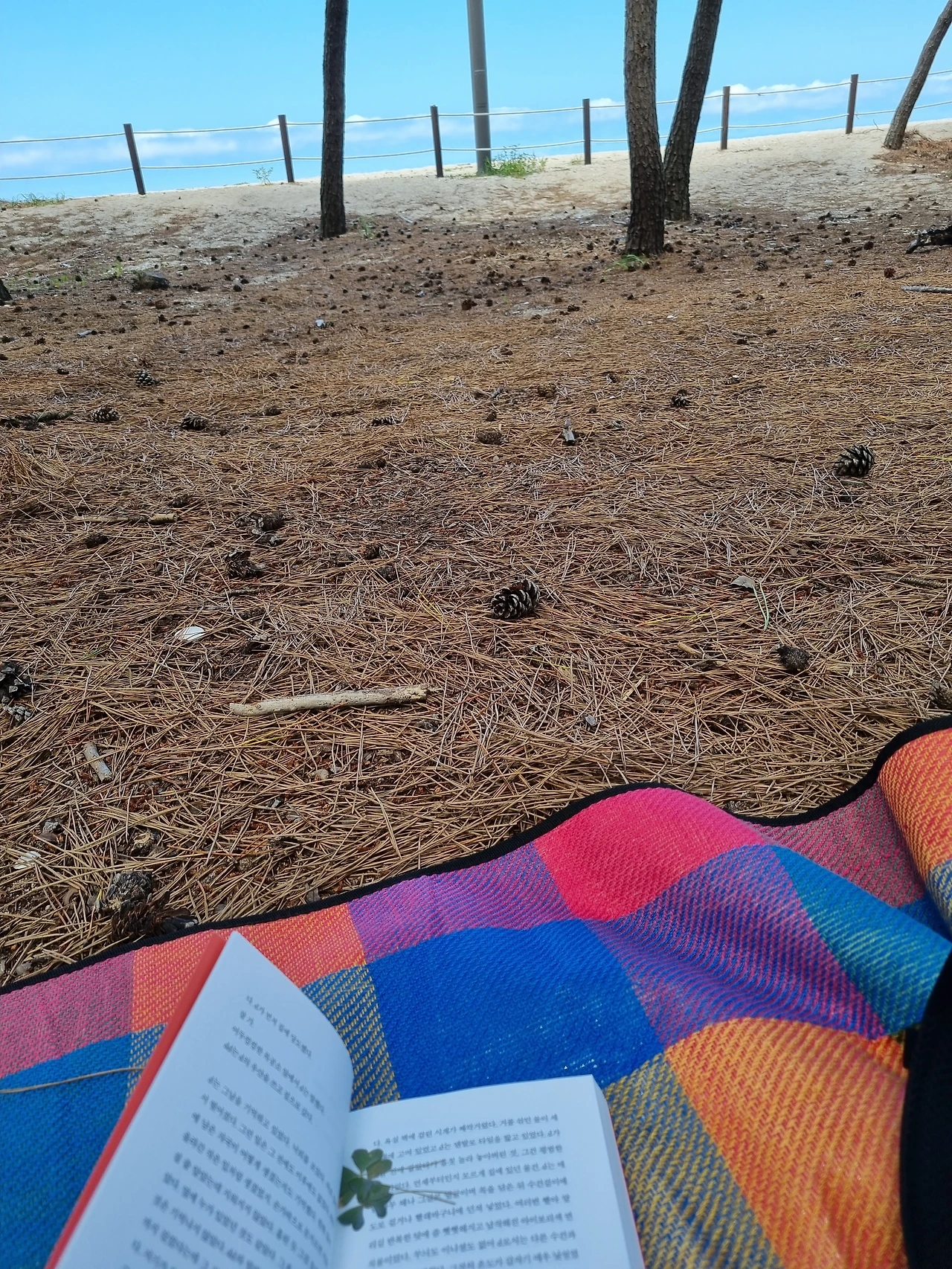 주변에는 돗자리 깔고 앉아 솔숲에서 고스톱 치는 어르신들이며, 바다 멍때리는 부부나 연인들이 두 커플 정도 있었고요, 친구들끼리 와서 깔깔거리거나 사진을 찍기도 하였습니다. 거기 앉아서 오래전에 읽다 만 책을 다시 처음부터 읽어 이야기 하나가 끝날 때까지 읽었습니다. 눕기도 하고, 앉기도 하고, 엎드리기도 하면서요.