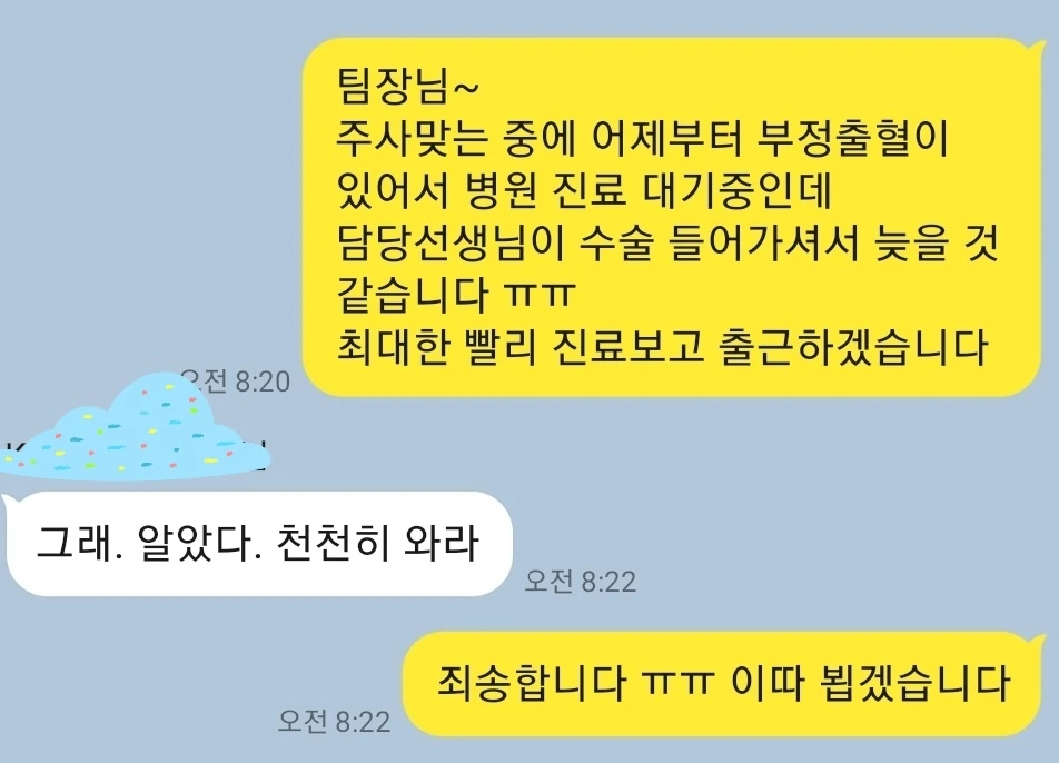 자, 그럼 운도 좋았고 새벽부터 부지런하게 움직여서 앞쪽 순번을 받았다고 가정해보자. 그럼 모든 걱정이 끝나느냐? 그것도 아니다. 응급환자나 시술이 생기면 담당 의사 선생님이 최소 30분 정도 자리를 비우게 되는데 이 시간 동안은 또 마냥 진료실 의자에 앉아 대기하며 팀장님께 말줄임표를 잔뜩 붙인 석고대죄 메시지를 드리는 수밖에 없다.