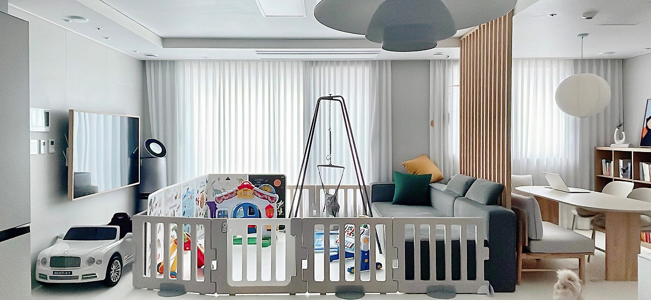 거실에서 아들의 공간을 치우면 이렇게 깔끔해진다. 그렇지만 깔끔한 거실은 아기 있는 집이 주는 따듯함이 없어 베이비룸 안에 장난감으로 가득 찬 거실을 더 좋아한다.