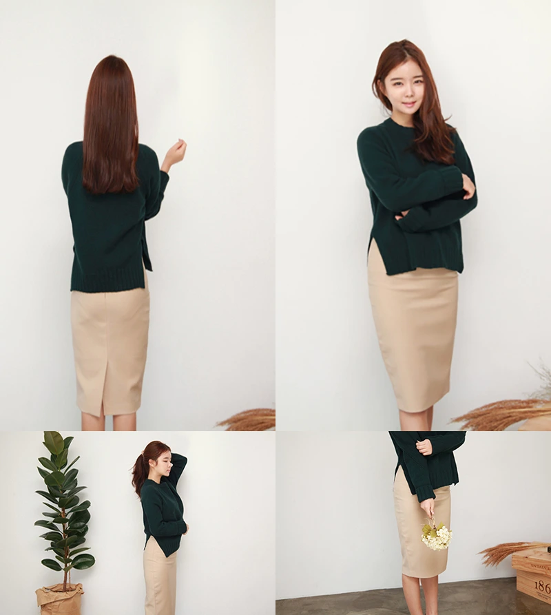 서있을 때는 미디스커트의 단정하고 단아한 느낌을 주지만 앉을 땐 절개선이 적당하게 벌어지기 때문에 무겁거나 딱딱하게 느껴지지 않고 보다 젊고 발랄하게 느껴진다. 거기다 베이비핑크 색상의 보송보송한 니트를 매치한다면 더욱 귀엽고 사랑스럽게 느껴질 수 있다.