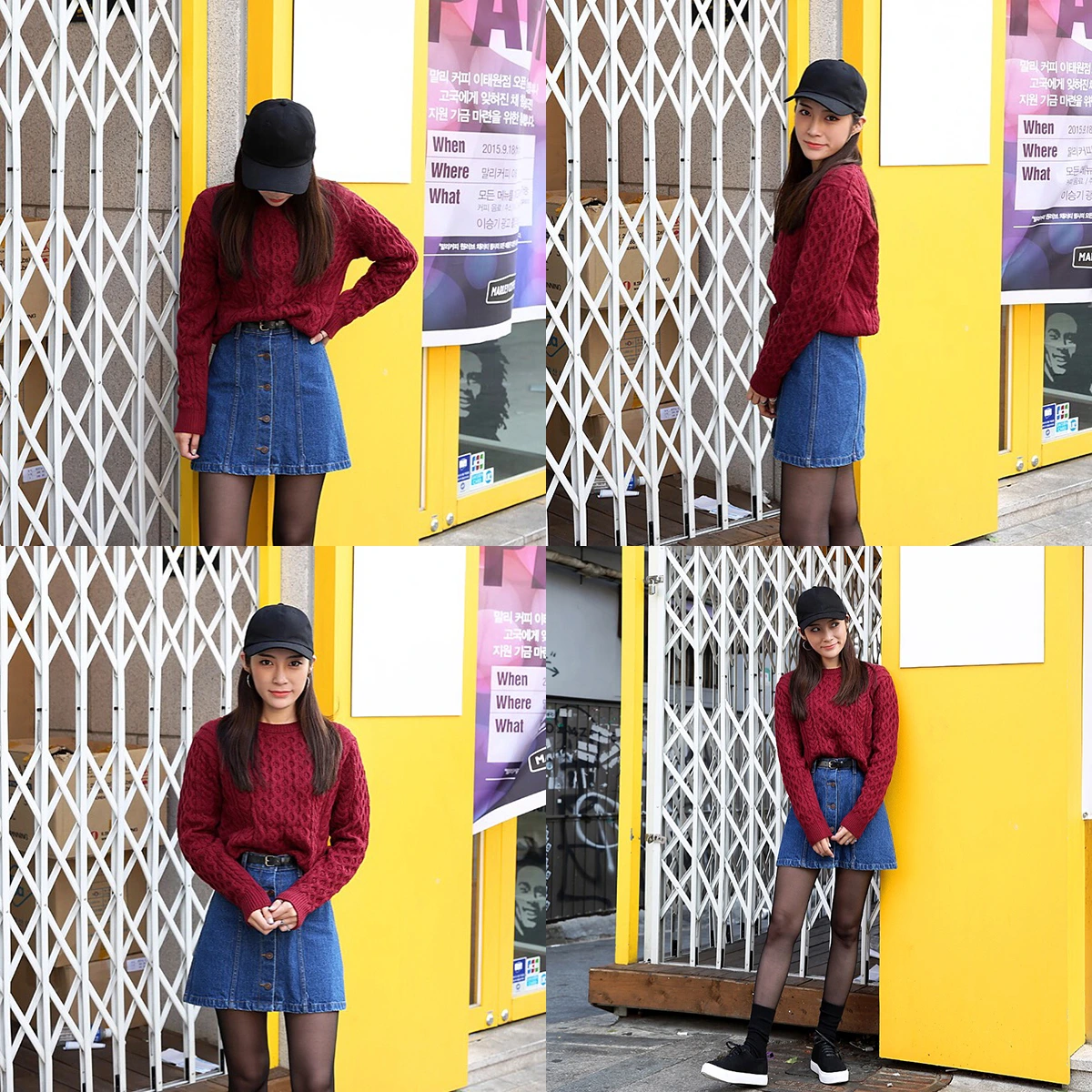 소재에 따라 또 색상에 따라 각 다른 느낌의 코디를 할 수 있는 디자인으로 사랑받고 있다. 그중의 베이직한 데님소재로 코디를 해 본다면 따뜻한 색감의 니트와 스커트를 매치 해 볼 수 있다.
