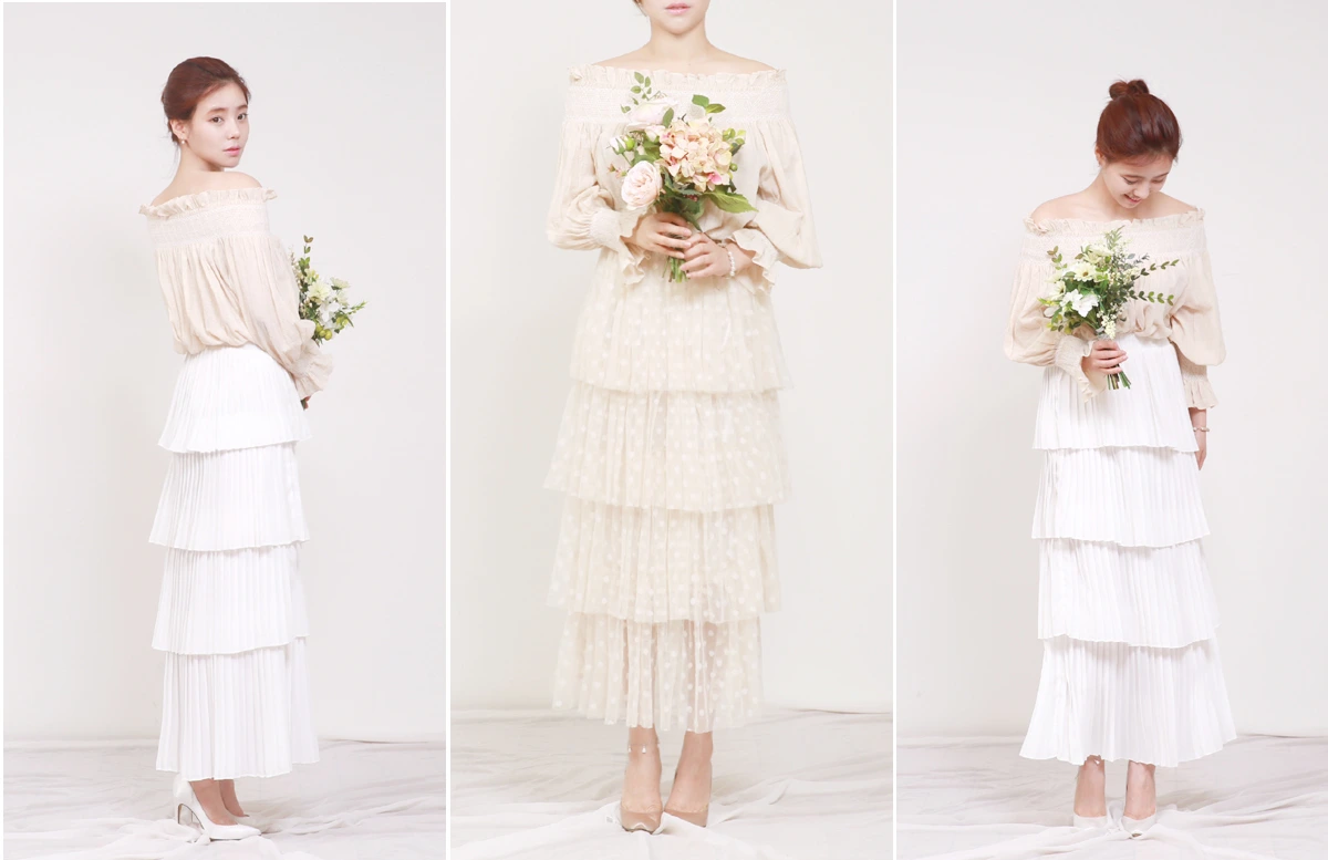 '웨딩'이라는 타이틀인 만큼 실패할 확률이 현저하게 떨어질 것이다. 목이 길지 않다거나, '셀프웨딩'룩에 더욱 여성스럽고 사랑스러움을 더하고 싶다면 '오프숄더 블라우스'를 상의로 매치해보는 것은 어떨까. 어깨의 선을 전부 드러낸 디자인인 만큼, 여성스러움의 상징인 쇄골을 더욱 돋보이게 할 수 있다.