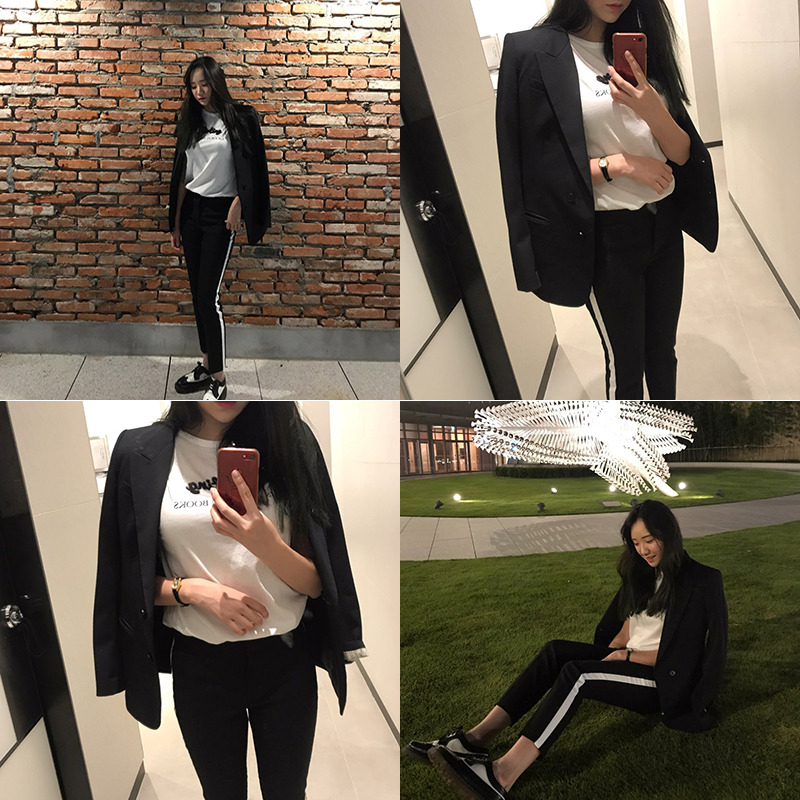 자칫 밋밋할 수 있는 슬랙스에 포인트가 되는 흰 라인이 들어간 바지 그리고 블랙 앤 화이트로 다들 가지고 있는 무채색의 티셔츠는 누구나 소화가능하고 멋스러운 코디다.