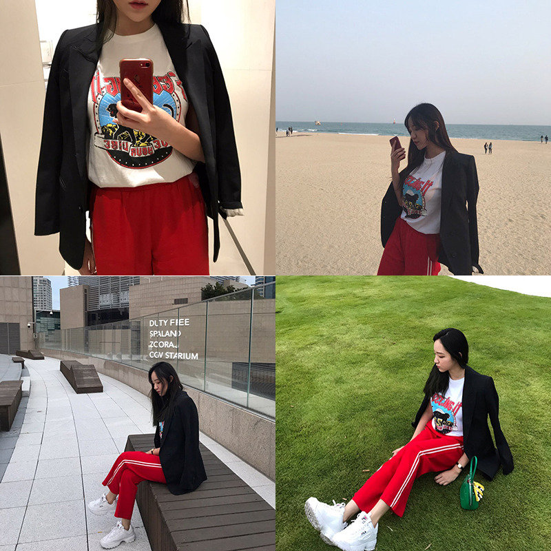 무채색에 답답해 보이고 더워 보이는 블레이저에 포인트를 주고 싶다면 강열한 빨간색의 트랙팬츠를 추천한다.