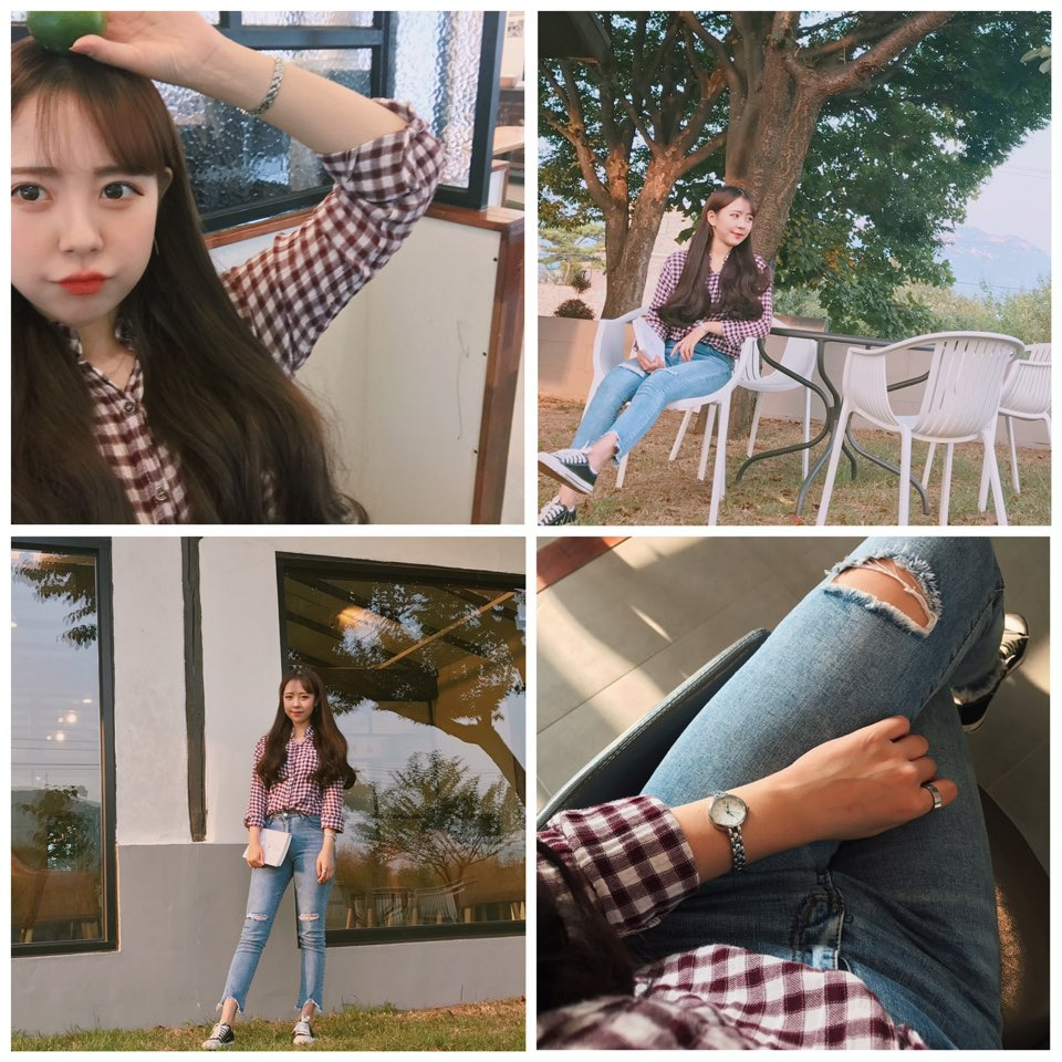 버건디 색상의 체크 남방과 청바지의 조화는 가을에 잘 어울리는 색감의 코디이다. 버건디는 코디하기 쉬우면서도 어렵다.