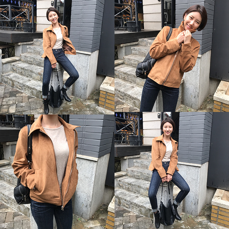 가을겨울 손이 많이 가게 되는 스웨이드재질로 원피스나 팬츠 티셔츠 코디에 하나만 걸쳐줘도 세련미가 나는 스웨이드 자켓과 함께 가을가을한 분위기가 나는 스타일이다.