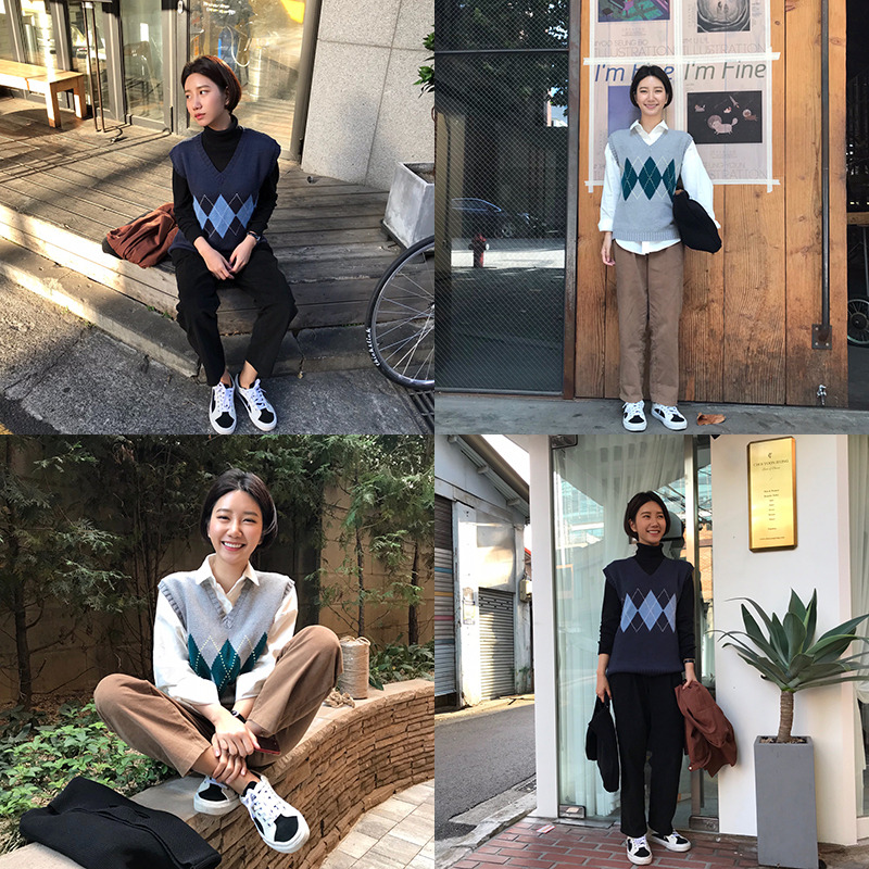 '고급스러움이 묻어 나오는 아가일 패턴으로 캐주얼함을 어필해드리는 니트조끼'. 올 시즌 유행인 아가일 패턴이 고급스러움을 어필해드리는 니트조끼.