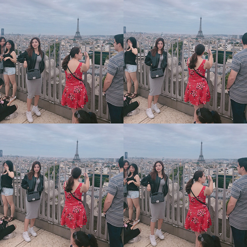 악세사리도 깔끔한 링 귀걸이를 착용하였고 헤어 또한 시원하게 위로 깔끔하게 묶어 생기 있는 스타일을 완성했다.