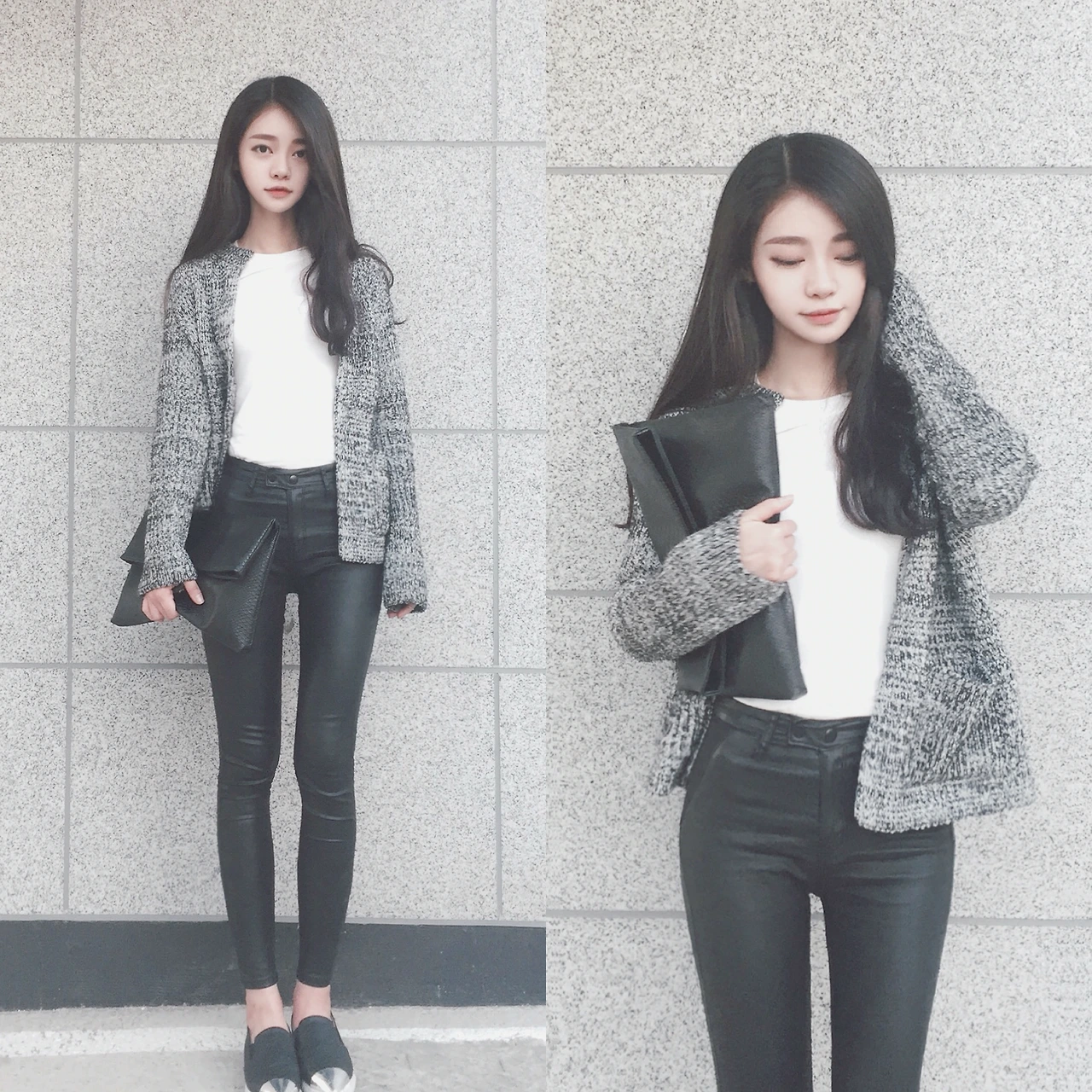 첫 번째로 가장 무난하고 많이들 입는 스키니와 가디건을 입어보았다. 편안하면서도 시크한 느낌을 줄 수 있도록 컬러매치는 블랙 앤 화이트로 깔끔함을 주었으며, 실버 토우의 스니커즈로 포인트를 주었다. 깔끔한 느낌을 주기위해 클러치 백으로 연출했다.