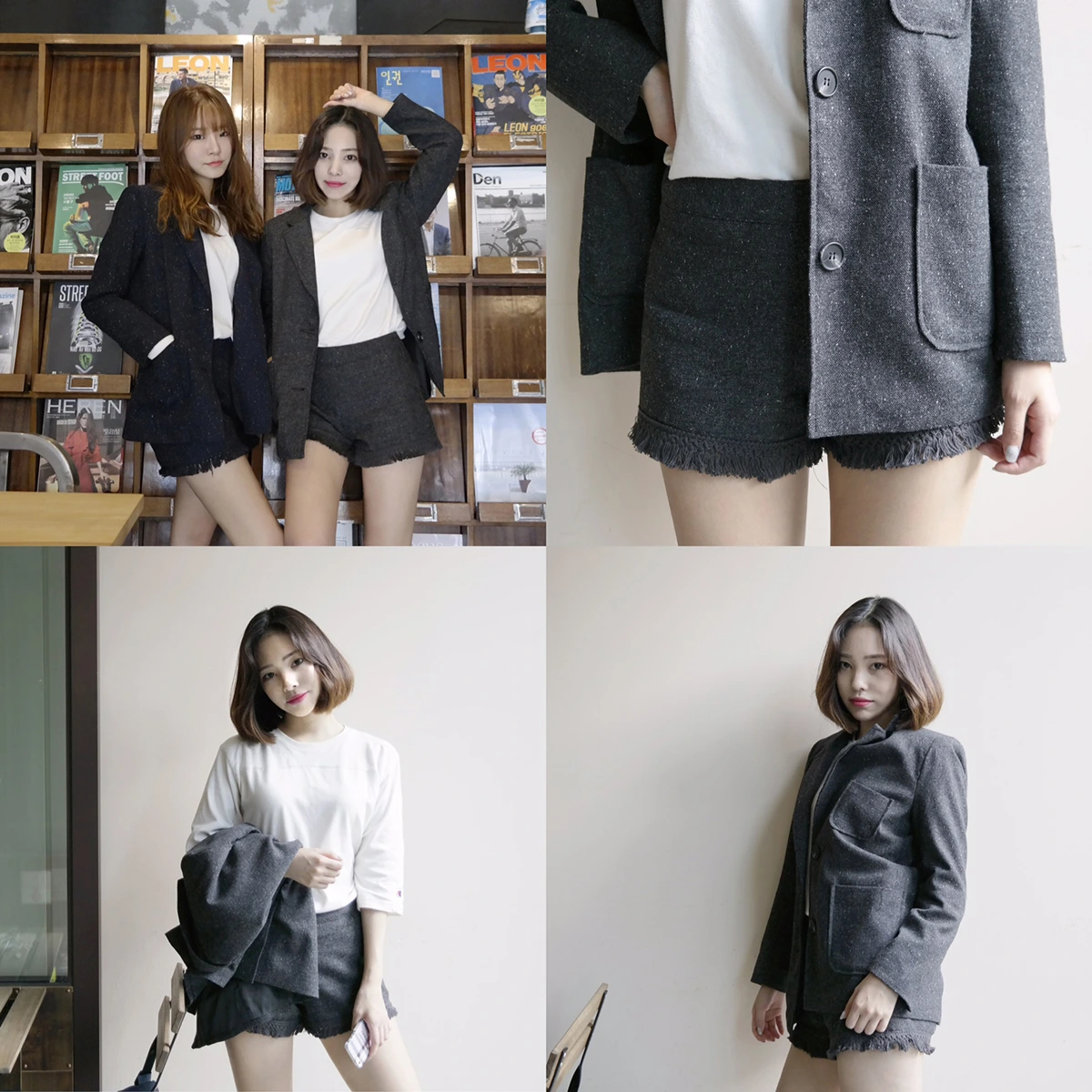 위 사진에 코디한 보카시 울 자켓과 반바지를 세트로 입으면 정장느낌과 동시에 세련된 이미지를 보이게 만드는 룩을 완성할 수 있고, 각자 다른 옷들과 매치해도 심심하지 않을 디자인이라 많은 사람의 사랑을 받고 있는 소재다.