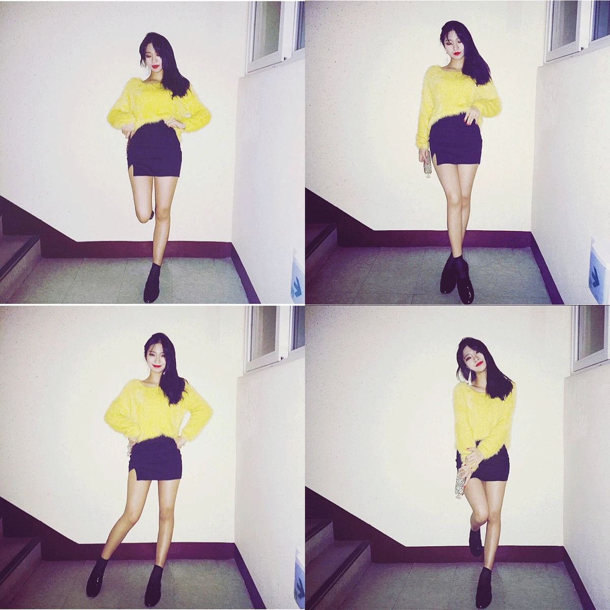 미니스커트에 노란색 니트를 입으면 귀여워 보이면서도 미니스커트로 섹시함을 보일 수 있는 스타일링이다. 상의가 화려한 컬러일 때는 하의는 블랙으로 통일시켜준다면 깔끔한 느낌을 줄 수가 있다.