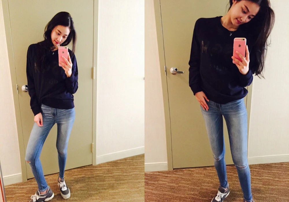 그런 단점을 보완하기 하기 위해 하이힐과 함께 청바지를 입으면 생각했던 것보다 훨씬 예쁜 핏을 만들 수가 있다. 특히 맨투맨이 어두운 계열일수록 진청보다는 중청이 잘 어울린다.