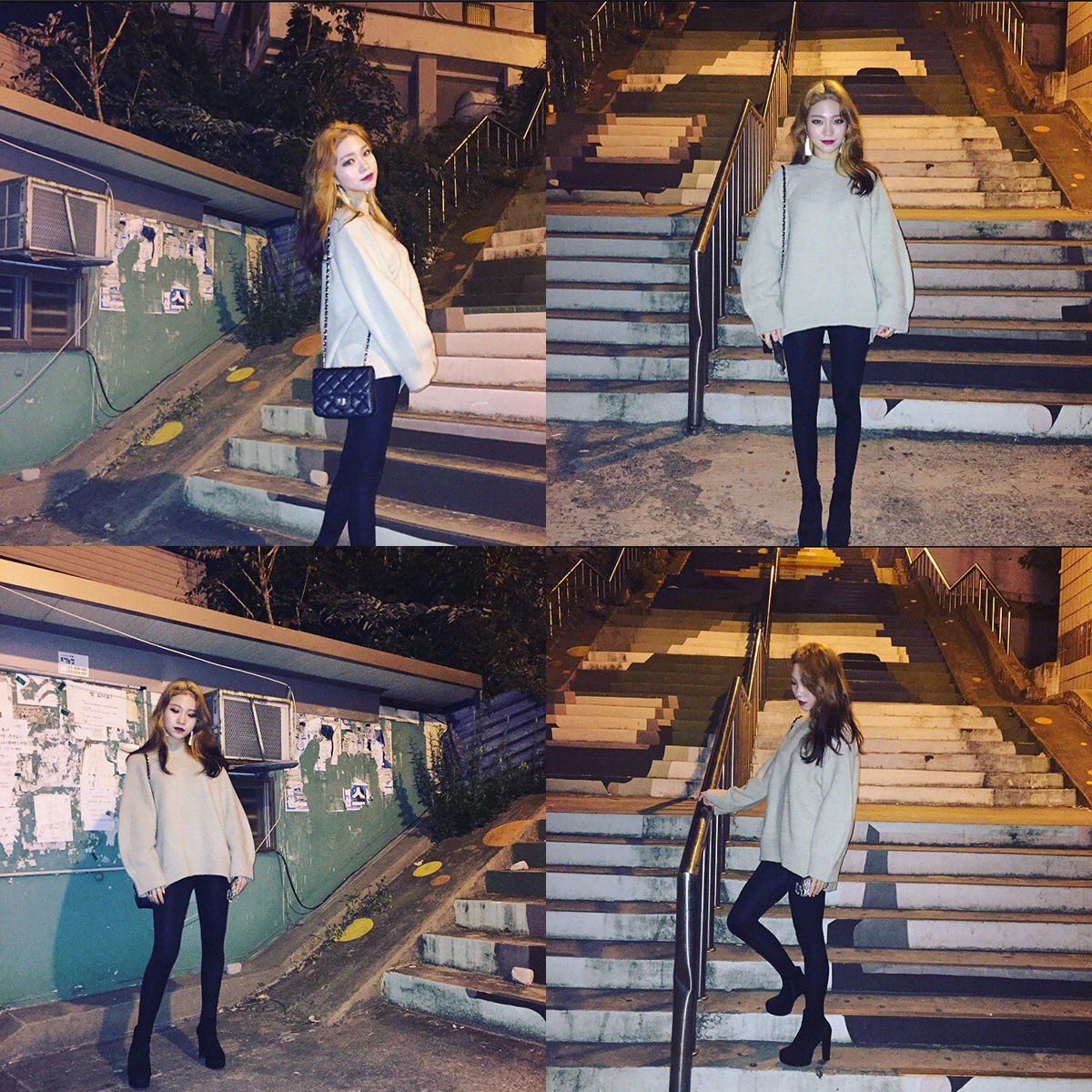 밝은 컬러의 니트와 함께 연출한다면 시선이 상의로 가기 때문에 블랙 레깅스로 인해 더 슬림하게 보이는 효과를 나타낼 수 있다.