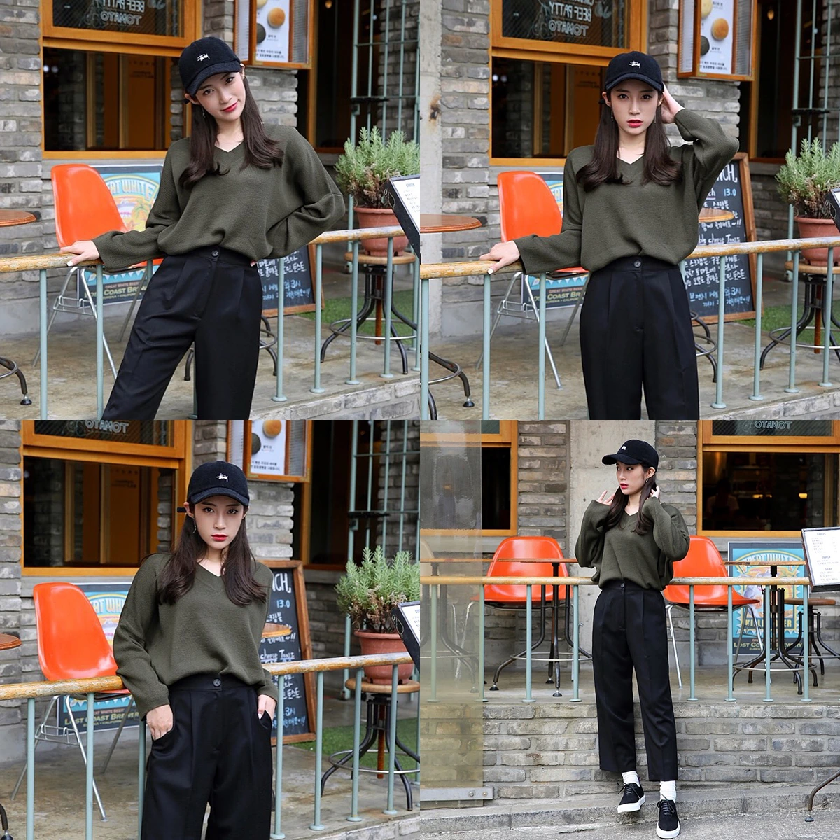 간단한 바지에 브이넥 니트 하나면 우리가 생각하는 기본 니트와는 다른 느낌을 줄 수 있기 때문이다. 더 과한 여성스러움을 원한다면 힐을 매치해 주면 되고, 여성스러움과 캐주얼한 느낌을 원한다면 스니커즈나 모자를 이용해도 좋다.