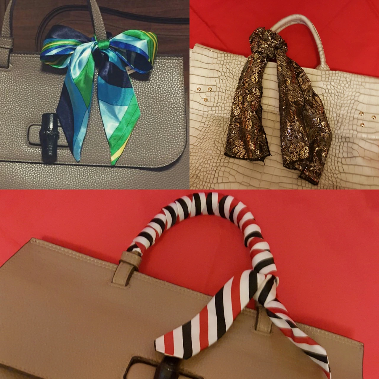 <가방에 포인트를 줄 수 있는 스카프>. 이때 손잡이 혹은 약간 가방의 가죽 중 해진 부분을 커버해주는 기능도 가능하기 때문에 활용도가 높은 편이다.