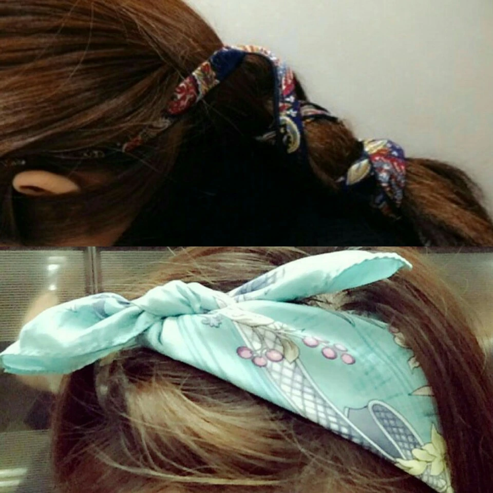 <헤어밴드, 헤어끈으로 변신>. 밋밋하고 부스스하기 도한 헤어라면 헤어 띠로 착용해도 센스 있는 패션이 될 수 있다. 긴머리 헤어라면 머리끈으로 머리를 질끈 묶은 후 스카프를 그 위에 다시 한 번 동여매는 것도 발랄한 느낌을 줄 수 있다. 이처럼 스카프를 헤어악세사리로 착용할 경우 발랄하고 큐티한 느낌을 증폭시킨다.