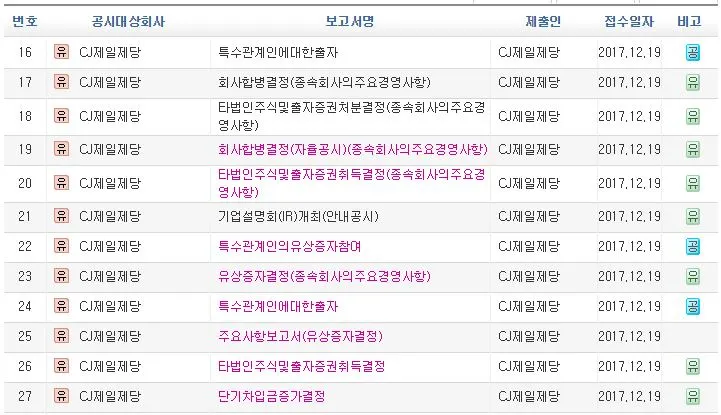 2017년 12월 19일, CJ제일제당은 지배구조 변경을 결정하며 하루에 무려 12개의 공시를 합니다.