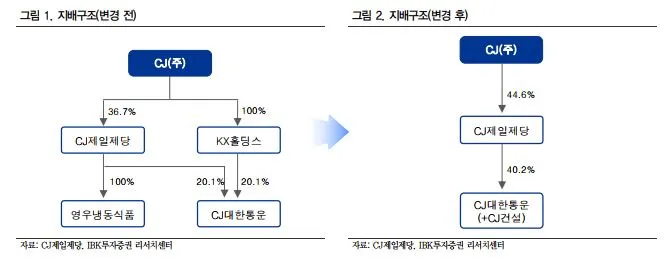 CJ제일제당은 원래 CJ대한통운 지분율을 20% 보유하고 있었지만, 이번 합병을 통해서 40% 보유하게 됩니다.